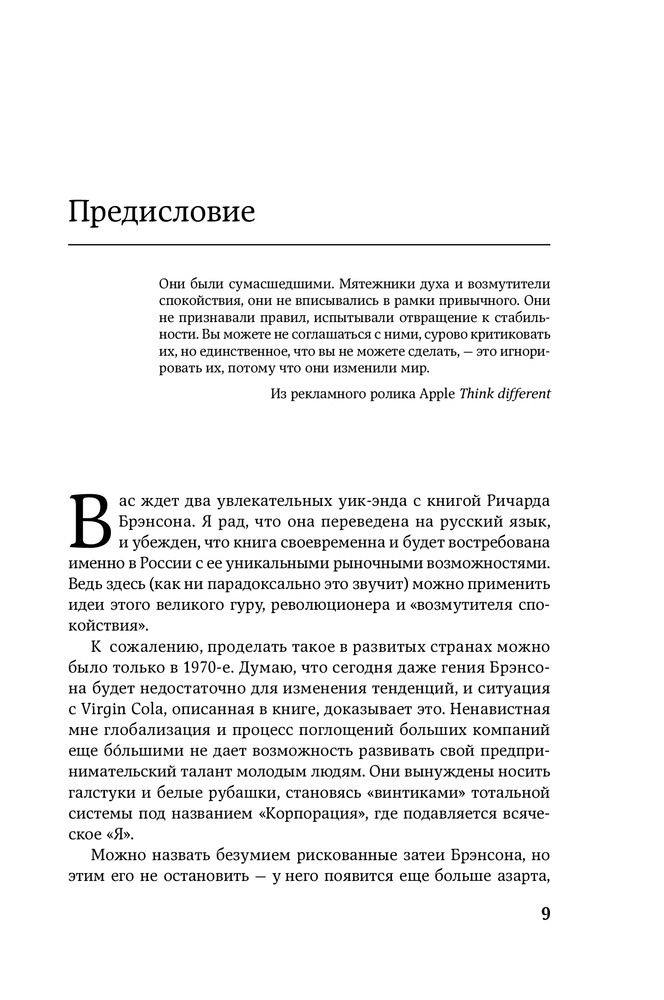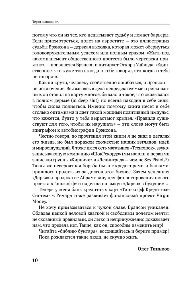 мне она очень понравилась. То как Р.Брэнсон описывает свою жизнь, то как он ставил перед собой цели и как он их достигал, и даже когда у него не получалось он все равно шел к своей цели. Как боролся и как искал выходы. То как он чувствовал и брал от жизни все. На самом деле стоит прочитать, особенно тем людям которые хотят добиться поставленных целей. Он начал заниматься маркетингом и привлечением за долго как это стало целой наукой. И то как он подбирал кадры, или как расставался с ними. И то как он был очень близок к родителям, говорит о том, что надо не забывать свои корни. Стоит почитать. Мне она зашла)