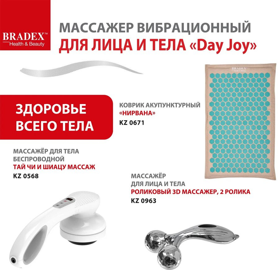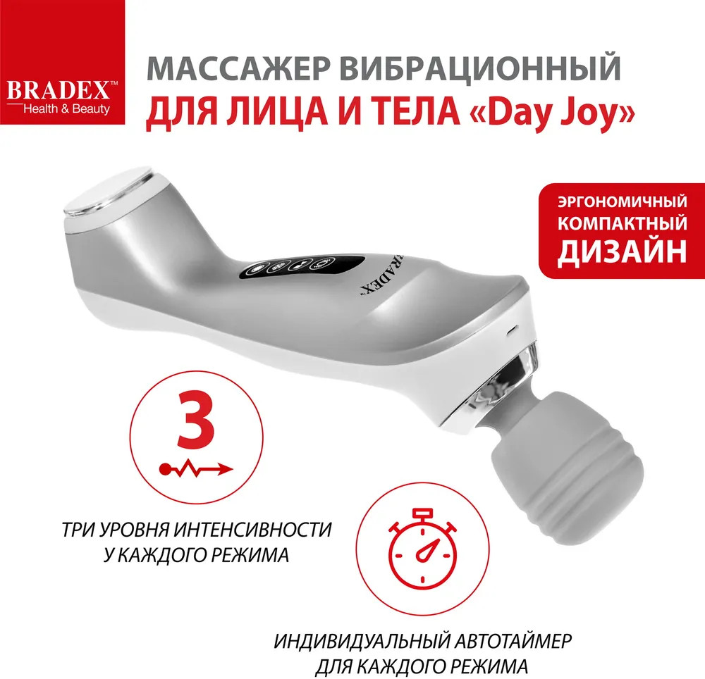 Bradex Массажер для лица и тела «Day Joy»В данный момент этот товар отсутствует в продаже. Возможно, у нас найдется аналогичный или похожий товар здесь. Массажер вибрационный для лица и тела «Day Joy» — беспроводной двусторонний массажер для проведения согревающего, освежающего, вибрационного массажа лица и тела в домашних условиях. 3 режима и 3 уровня мощности позволяют подобрать оптимальный вариант с учетом индивидуальных особенностей кожи. Горячий расслабляющий лифтинг-массаж подтягивает кожу лица, шеи и декольте, способствует устранению морщин, брылей и второго подбородка. Холодный тонизирующий массаж снимает отечность, сокращает расширенные поры, повышает упругость и эластичность кожи, стимулирует лимфодренаж и тканевое дыхание. Вибрационный массаж тела расслабляет мышцы, снимает напряжение, усталость, стимулирует кровообращение, подтягивает кожу, оказывает антицеллюлитный эффект. Вибромассажер подходит для профилактики артрита, мышечной атрофии. Он отлично помогает восстановиться после активных тренировок в спортзале, после напряженного трудового дня людям, которые проводят целый день на ногах: учителя, врачи, продавцы, или выполняют сидячую работу: офисные работники, водители. Компактный массажер удобно брать с собой: он не занимает много места, заряжается через USB. |