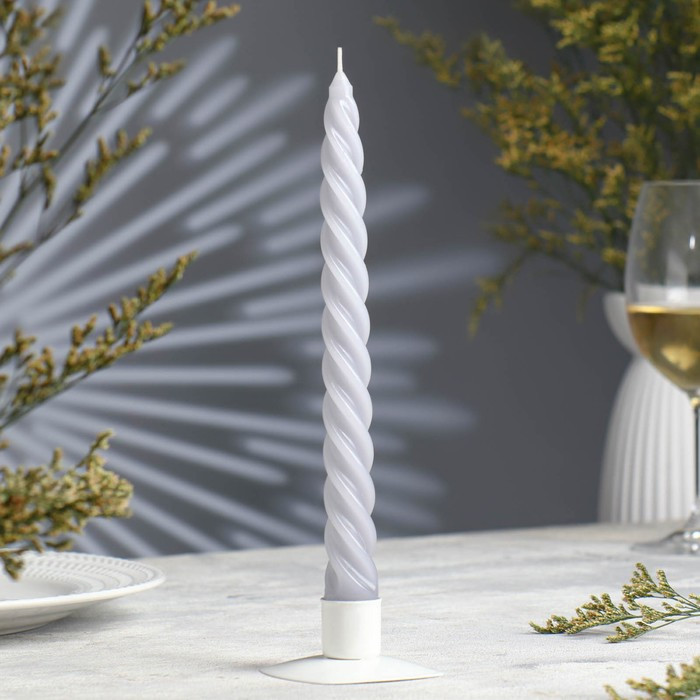 Свеча достаточно высокая, светло-серого оттенка, хорошо помешается в стандартные подсвечники