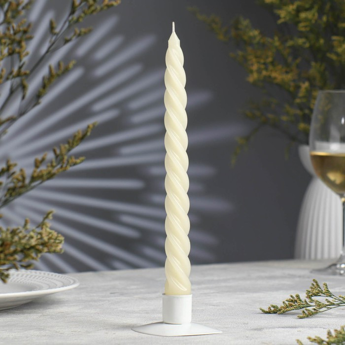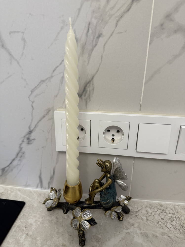 Свеча достаточно высокая, светло-серого оттенка, хорошо помешается в стандартные подсвечники