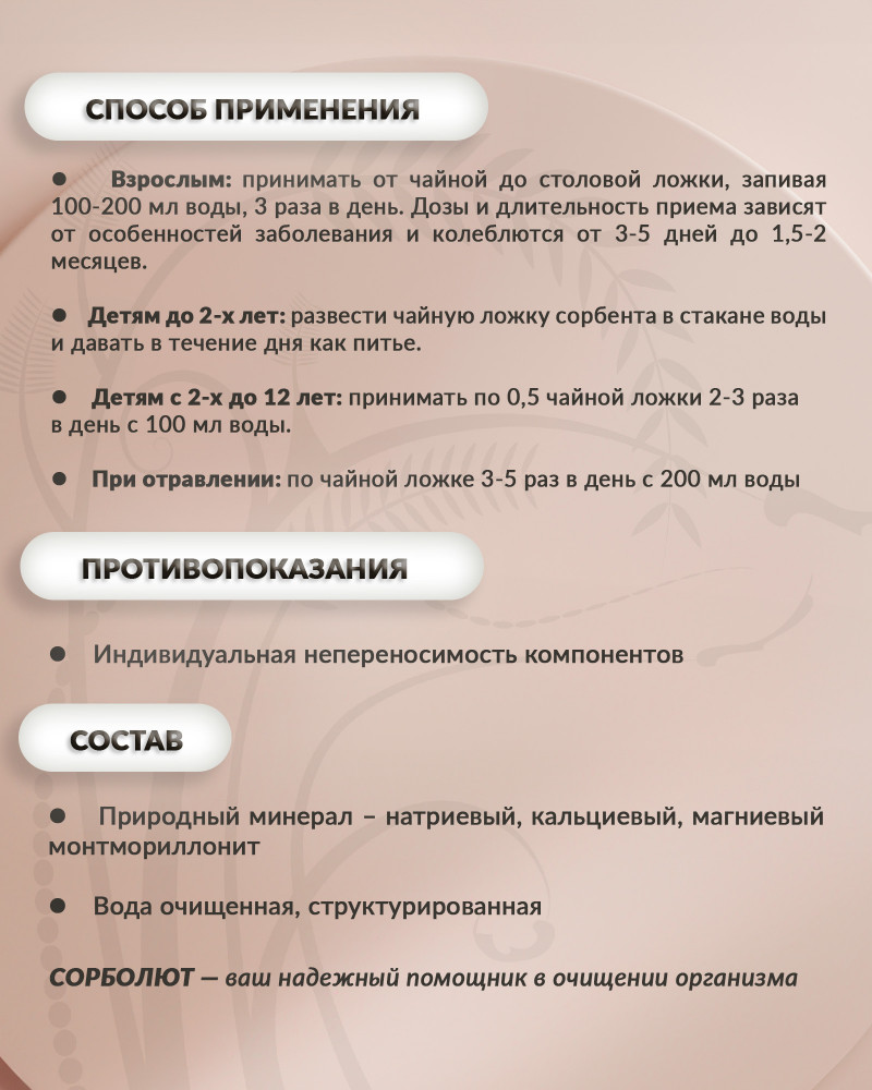 мягкая очистка с минералами свежий лучше энтеросгеля Сорболют — энтеросорбент высшего класса. Благодаря свойствам «Сорболюта» качественно обволакивать слизистую ЖКТ, обеспечивается её надёжная защита, абсорбирование токсинов от жизнедеятельности паразитов, а также бактерий, вирусов, аллергенов, продуктов распада в ходе жизнедеятельности организма.
