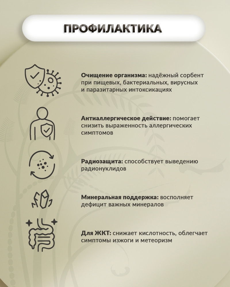 Область применения: в качестве энтеросорбента для вывода из организма солей тяжелых металлов, при пищевых отравлениях, изжоге, метеоризме, аллергии, а также в качестве источника природных микроэлементов.