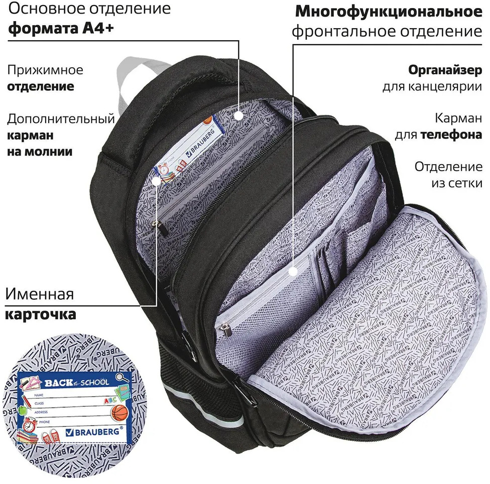 • в основном отделении рюкзака можно легко и быстро разместить учебники и тетради формата А4+, а также воспользоваться прижимным отделением и дополнительным карманом на молнии. Внутри фронтального отделения находится органайзер для канцтоваров, карман для телефона и большое отделение из сетки. Большой передний карман на молнии вмещает тетради и учебники формата А5. Такая организация пространства поможет держать принадлежности в сохранности и приучить ребенка к порядку;