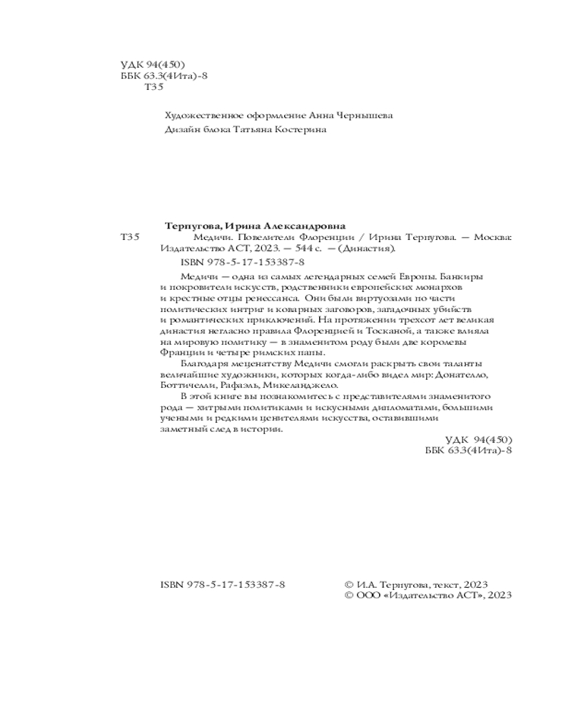 💳 Оплатить за товар можно при получении 🇰🇿 Есть бесплатная доставка по Казахстану от 1 дня 🎁 Копите бонусы с каждой покупки Серия: Династия Они были виртуозами по части политических интриг и коварных заговоров, загадочных убийств и романтических приключений. На протяжении трехсот лет великая династия негласно правила Флоренцией и Тосканой, а также влияла на мировую политику — в знаменитом роду были две королевы Франции и четыре римских папы. Благодаря меценатству Медичи смогли раскрыть свои таланты величайшие художники, которых когда-либо видел мир: Донателло, Боттичелли, Рафаэль, Микеланджело. В этой книге вы познакомитесь с представителями знаменитого рода — хитрыми политиками и искусными дипломатами, большими учеными и редкими ценителями искусства, оставившими заметный след в истории. |