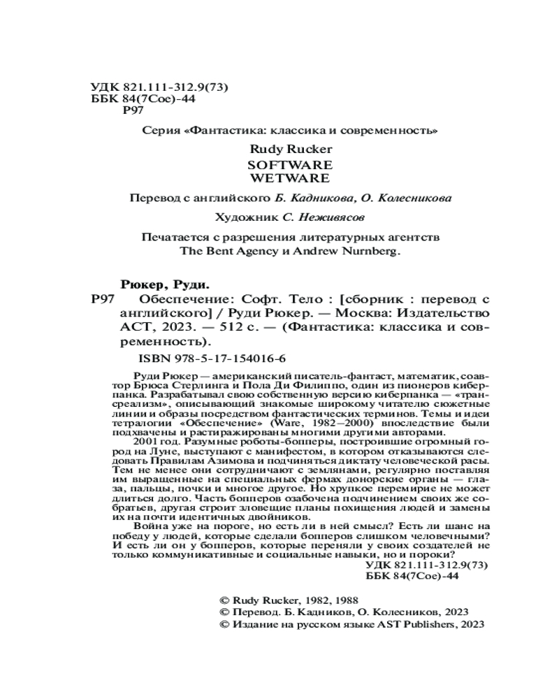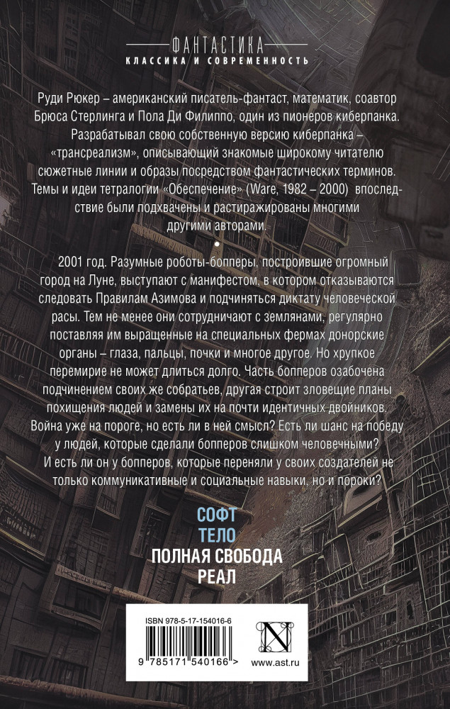 💳 Оплатить за товар можно при получении 🇰🇿 Есть бесплатная доставка по Казахстану от 1 дня 🎁 Копите бонусы с каждой покупки Серия: Фантастика: классика и современность Руди Рюкер — американский писатель-фантаст, математик, соавтор Брюса Стерлинга и Пола Ди Филиппо, один из пионеров киберпанка. Разрабатывал свою собственную версию киберпанка — «трансреализм», описывающий знакомые широкому читателю сюжетные линии и образы посредством фантастических терминов. Темы и идеи тетралогии «Обеспечение» (Ware, 1982 — 2000) впоследствие были подхвачены и растиражированы многими другими авторами. |
