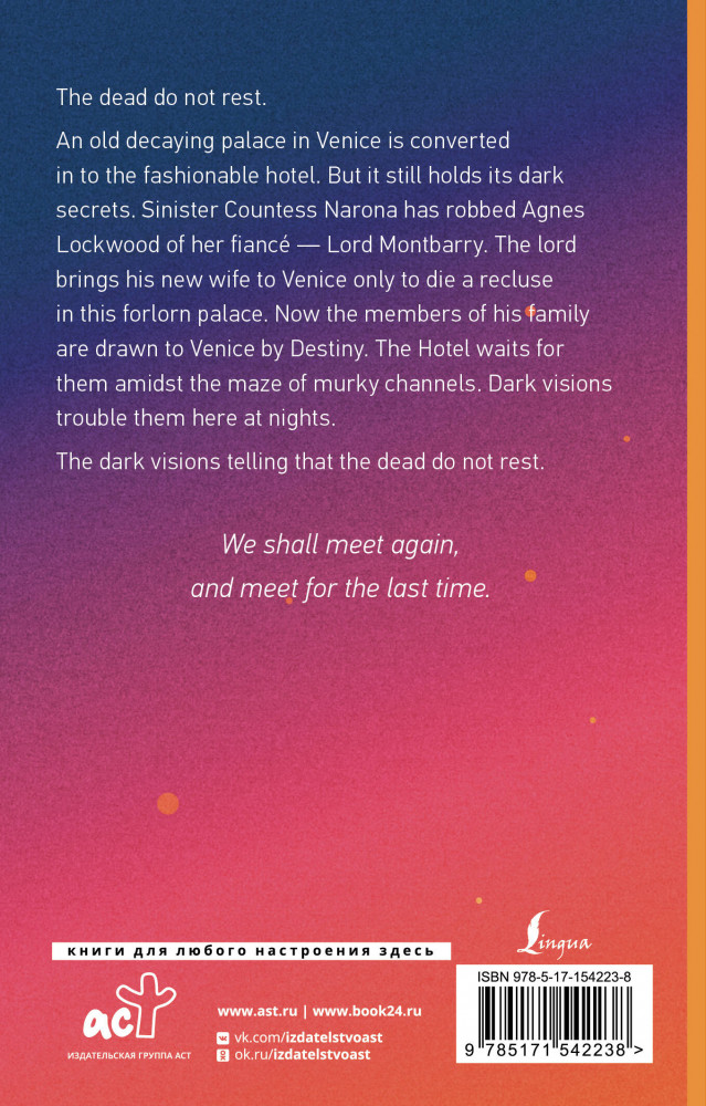 💳 Оплатить за товар можно при получении 🇰🇿 Есть бесплатная доставка по Казахстану 🎁 Копите бонусы с каждой покупки Серия: Exclusive Classics Paperback Манит призрак Венеции? Познакомьтесь с её тайнами в «Таинственном отеле» Уилки Коллинза! Город дворцов, каналов, смерти и загадок ждёт вас. Уилки Коллинз — создатель первого детективного романа на английском языке, плодовитый писатель, мастер мистики и загадок. Его язык вполне современен и понятен, поэтому эта книга станет хорошим выбором для тех, кто хочет попробовать начать читать в оригинале. В «Таинственном отеле» вы столкнетесь с таинственной смертью и исчезновением, произошедшем в одном из старых палаццо Венеции. Старый дворец переделали в модный отель, но загадка всё ещё притягивает тех, кто связан с ней, сводя их с ума. Дерзните посетить этот отель сами, если осмелитесь. |