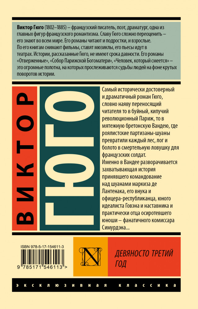 💳 Оплатить за товар можно при получении 🇰🇿 Есть бесплатная доставка по Казахстану от 1 дня 🎁 Копите бонусы с каждой покупки Серия: Эксклюзивная классика Самый исторически достоверный и драматичный роман Гюго, словно наяву переносящий читателя то в буйный, кипучий революционный Париж, то в мятежную бретонскую Вандею, где роялистские партизаны-шуаны пре-вратили каждый лес, лог и болото в смертельную ловушку для французских солдат. Именно в Вандее разворачивается захватывающая история принявшего командование над шуанами маркиза де Лантенака, его внука и офицера-республиканца, юного идеалиста Говэна и наставника и практически отца осиротевшего юноши — фанатичного комиссара Симурдэна... |