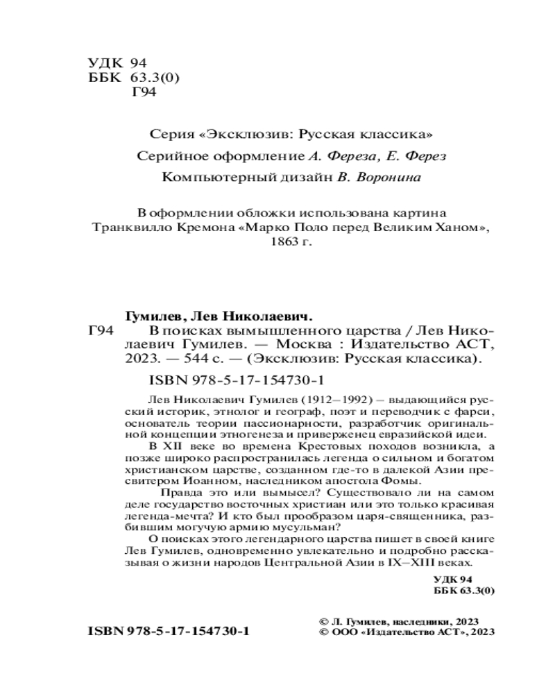 💳 Оплатить за товар можно при получении 🇰🇿 Есть бесплатная доставка по Казахстану от 1 дня 🎁 Копите бонусы с каждой покупки Серия: Эксклюзив: Русская классика Лев Николаевич Гумилев (1912 — 1992) — выдающийся русский историк, этнолог и географ, поэт и переводчик с фарси, основатель теории пассионарности, разработчик оригинальной концепции этногенеза и приверженец евразийской идеи. В XII веке во времена Крестовых походов возникла, а позже широко распространилась легенда о сильном и богатом христианском царстве, созданном где-то в далекой Азии пресвитером Иоанном, наследником апостола Фомы. |