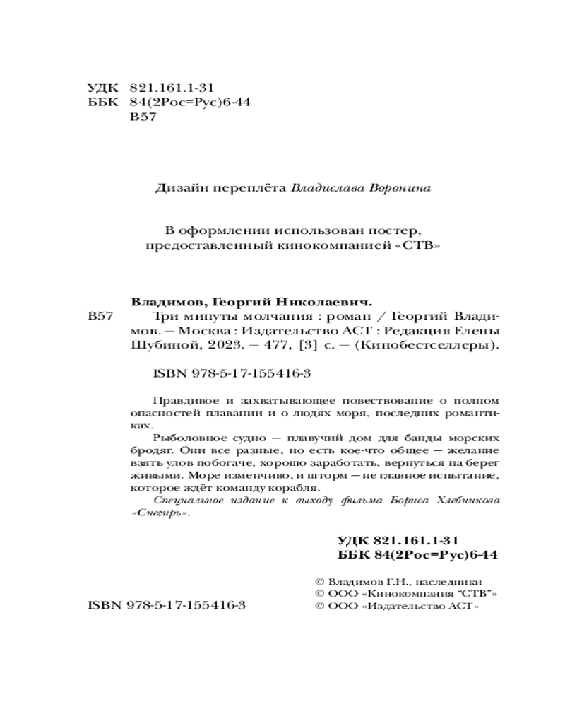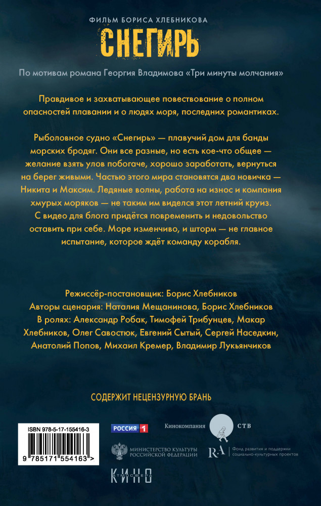Три минуты молчания. СнегирьВ данный момент этот товар отсутствует в продаже. Возможно, у нас найдется аналогичный или похожий товар здесь. Серия: Кинобестселлеры Правдивое и захватывающее повествование о полном опасностей плавании и о людях моря, последних романтиках. Рыболовное судно «Снегирь» — плавучий дом для банды морских бродяг. Они все разные, но есть кое-что общее — желание взять улов побогаче, хорошо заработать, вернуться на берег живыми. Частью этого мира становятся два новичка — Никита и Максим. Ледяные волны, работа на износ и компания хмурых моряков — не таким им виделся этот летний круиз. С видео для блога придётся повременить и недовольство оставить при себе. Море изменчиво, и шторм — не главное испытание, которое ждёт команду корабля. |
