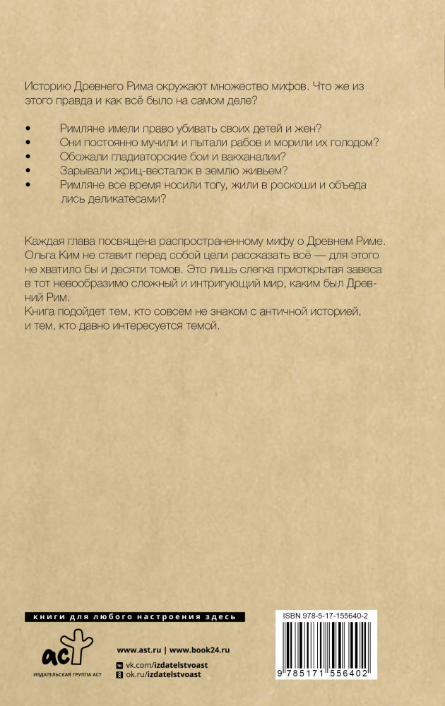 💳 Оплатить за товар можно при получении 🇰🇿 Есть бесплатная доставка по Казахстану от 1 дня 🎁 Копите бонусы с каждой покупки Серия: История без купюр Римляне имели право убивать своих детей и жен? Они постоянно мучили и пытали рабов и морили их голодом? Обожали гладиаторские бои и вакханалии? Зарывали жриц-весталок в землю живьем? Римляне все время носили тогу, жили в роскоши и объедались деликатесами? Историю Древнего Рима окружают множество мифов. Что из этого правда и как всё было на самом деле? Об этом рассказывает эта книга. |