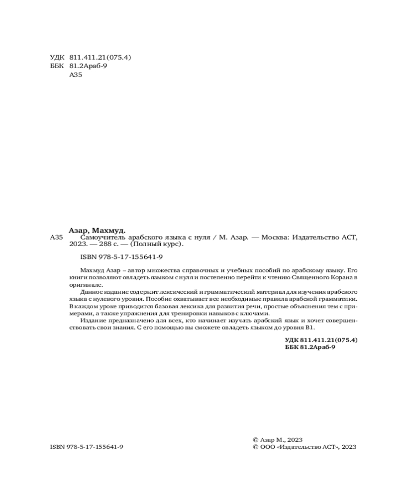 💳 Оплатить за товар можно при получении 🇰🇿 Есть бесплатная доставка по Казахстану 🎁 Копите бонусы с каждой покупки Серия: ПолныйКурс Махмуд Азар — автор множества справочных и учебных пособий по арабскому языку. Его книги позволяют овладеть языком с нуля и постепенно перейти к чтению Священного Корана в оригинале. Данное издание содержит лексический и грамматический материал для изучения арабского языка с нулевого уровня. Пособие охватывает все необходимые правила арабской грамматики. В каждом уроке приводится базовая лексика для развития речи, простые объяснения тем с примерами, а также упражнения для тренировки навыков с ключами. |