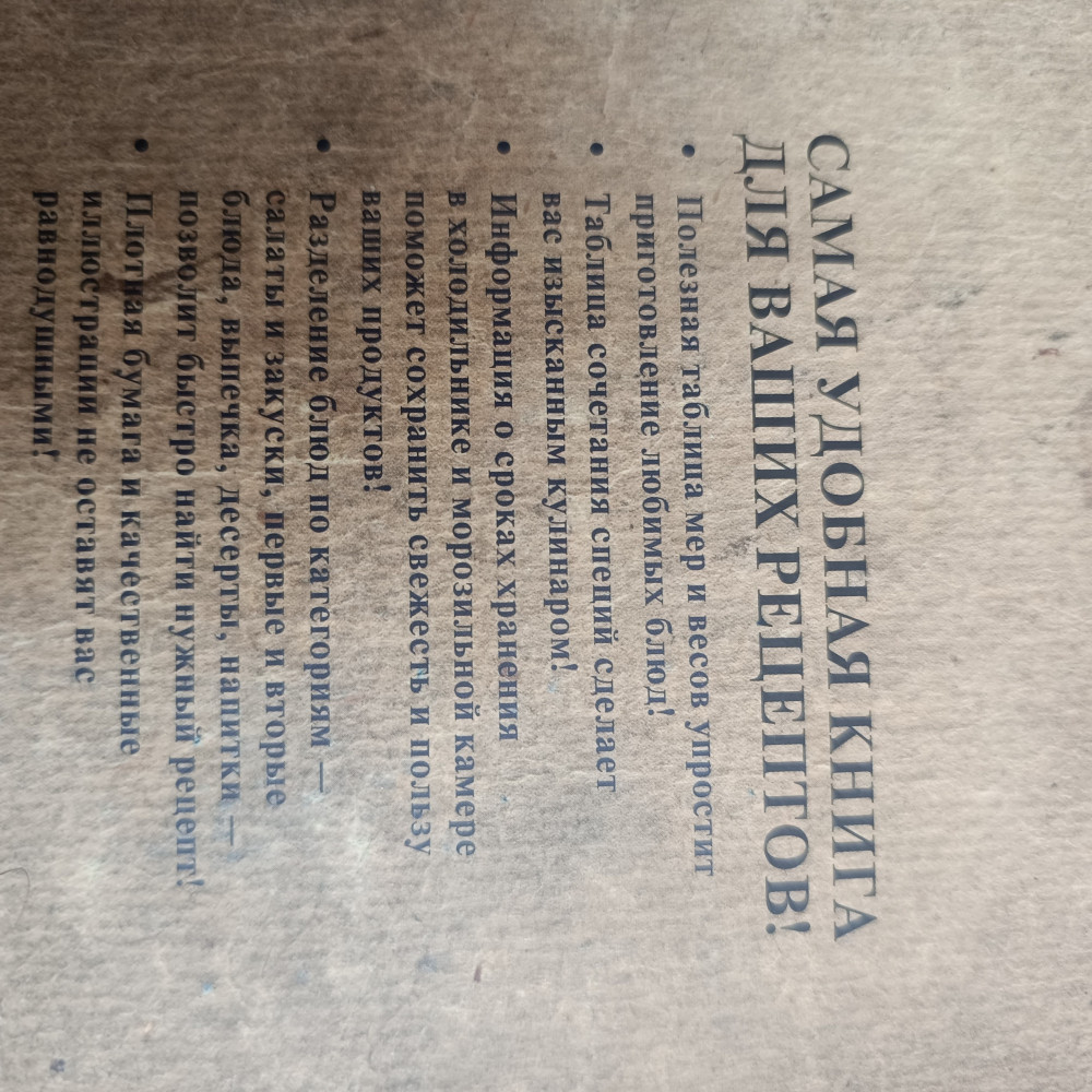 Отличная книга. Деления на первые, вторые блюда, десерты, выпечки. Удобно вести записи рецептов. Не нужно тратить время на интернет