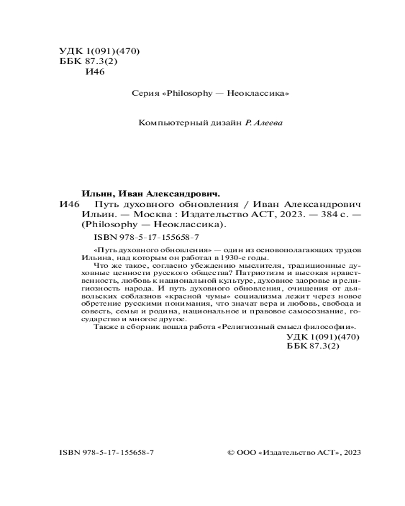 💳 Оплатить за товар можно при получении 🇰🇿 Есть бесплатная доставка по Казахстану от 1 дня 🎁 Копите бонусы с каждой покупки Серия: Philosophy — неоклассика «Путь духовного обновления» — один из основополагающих трудов Ильина, над которым он работал в 1930-е годы. Что же такое, согласно убеждению мыслителя, традиционные духовные ценности русского общества? Патриотизм и высокая нравственность, любовь к национальной культуре, духовное здоровье и религиозность народа. И путь духовного обновления, очищения от дьявольских соблазнов «красной чумы» социализма лежит через новое обретение русскими понимания, что значат вера и любовь, свобода и совесть, семья и родина, национальное и правовое самосознание, государство и многое другое. Также в сборник вошла работа «Религиозный смысл философии». |