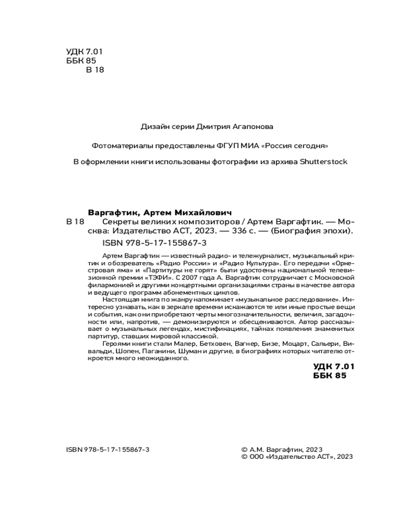 | Артем Михайлович Варгафтик -Российский музыкальный критик и телеведущий. Окончил Российскую Академию музыки им. Гнесиных как виолончелист и аспирантуру Московской консерватории по кафедре истории и теории исполнительства. Играл на виолончели в нескольких оркестрах. С 1997 года - преподаватель истории виолончельного искусства в Российской Академии музыки. В 1994-2003 - музыкальный обозреватель радиостанции «Эхо Москвы», с 2004 года - ведущий программы «Спорная музыка» на канале «Маяк-FM». С... |