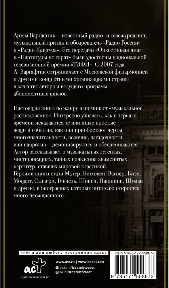 Секреты великих композиторовВ данный момент этот товар отсутствует в продаже. Возможно, у нас найдется аналогичный или похожий товар здесь. Серия: Биография эпохи Настоящая книга по жанру напоминает «музыкальное расследование». Интересно узнавать, как в зеркале времени искажаются те или иные простые вещи и события, как они приобретают черты многозначительности, величия, загадочности или напротив — демонизируются и обесцениваются. Автор рассказывает о музыкальных легендах, мистификациях, тайнах появления знаменитых партитур, ставших мировой классикой. Героями книги стали Малер, Бетховен, Вагнер, Бизе, Моцарт, Сальери, Гендель, Шопен, Паганини, Шуман и другие, в биографиях которых читателю откроется много неожиданного. |