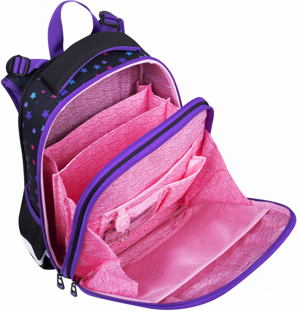 • в основном отделении ранца можно легко и быстро разместить учебники и тетради между двумя плотными перегородками. Внутри фронтального отделения находится органайзер для канцтоваров, карман для телефона, съёмный карабин для ключей и большое отделение из сетки. Ранец широко раскрывается, повышая удобство использования, а за счёт боковых перегородок содержимое не выскользнет из ранца;