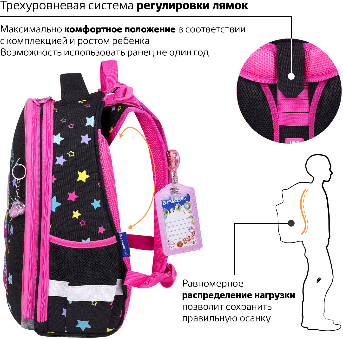 • регулируемые по длине и высоте лямки можно оптимально подогнать под комплекцию ребенка, чтобы ранец носился с комфортом, несмотря на зачастую избыточный вес содержимого: учебников, тетрадей, канцтоваров. Регулировка позволит использовать ранец не один год;