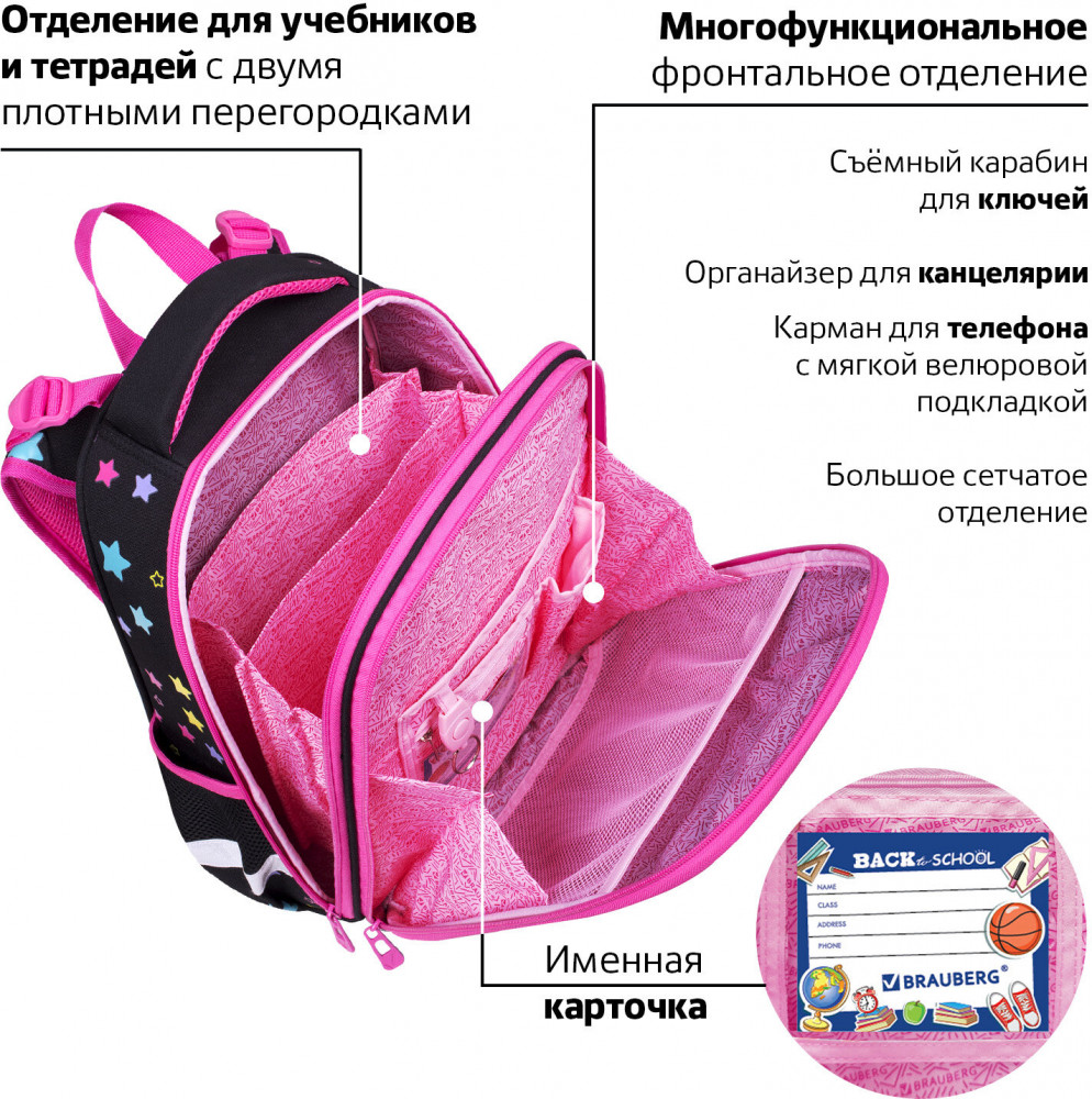 • в основном отделении ранца можно легко и быстро разместить учебники и тетради между двумя плотными перегородками. Внутри фронтального отделения находится органайзер для канцтоваров, карман для телефона, съёмный карабин для ключей и большое отделение из сетки. Ранец широко раскрывается, повышая удобство использования, а за счёт боковых перегородок содержимое не выскользнет из ранца;