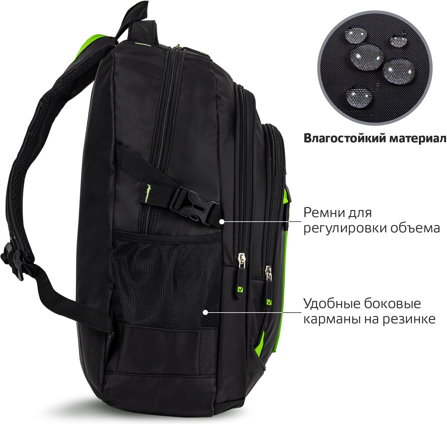 Водонепроницаемый материал, хорошие швы, вместительный. В общем ребенок очень доволен