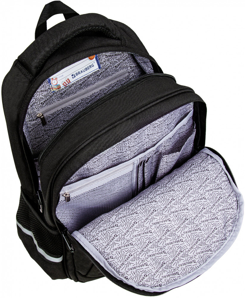 • в основном отделении рюкзака можно легко и быстро разместить учебники и тетради между двумя плотными перегородками. Внутри фронтального отделения находится органайзер для канцтоваров, карман для телефона, съёмный карабин для ключей и большое отделение из сетки;