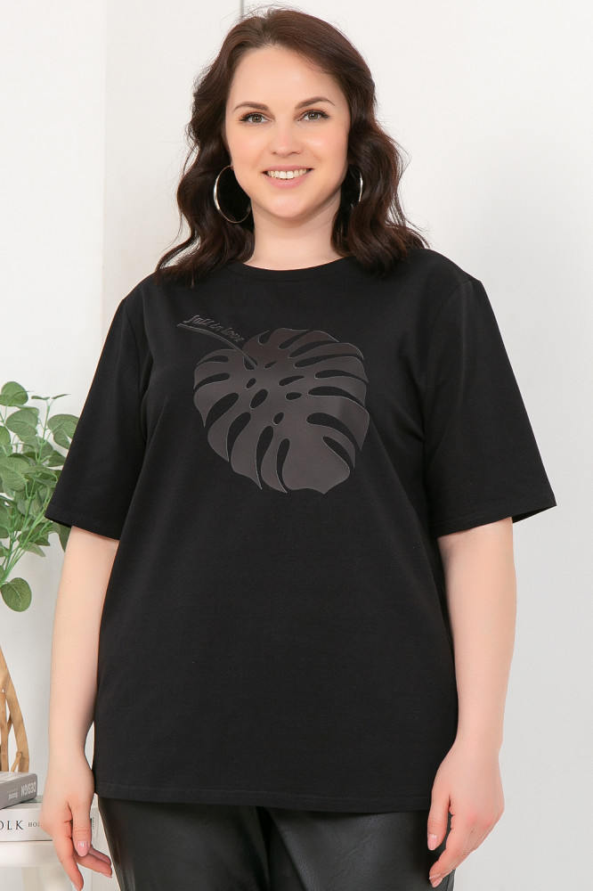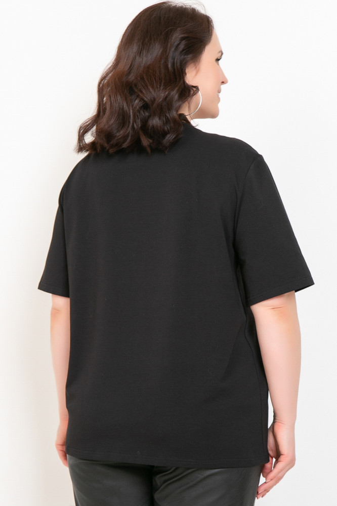 Блуза женская прямого силуэта. Горловина круглая, с притачной бейкой. Рукав втачной, короткий. Посередине переда выполнена печать. Изделие изготовлено из кулирной глади.