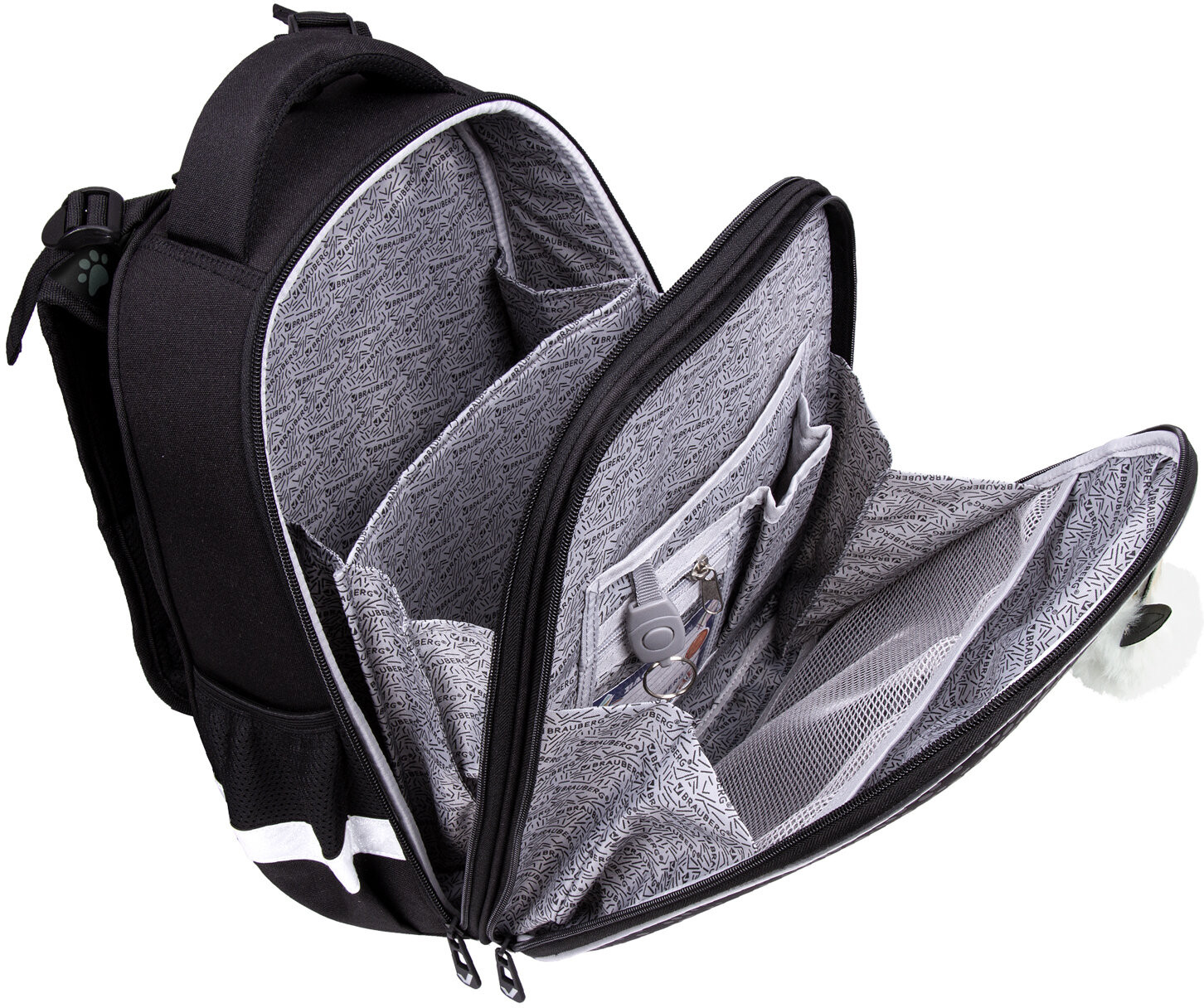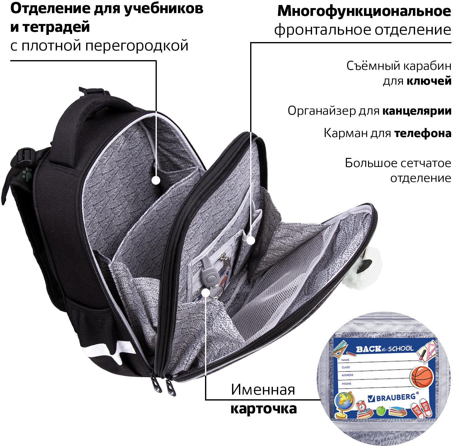 • в основном отделении ранца можно легко и быстро разместить учебники и тетради между двумя плотными перегородками. Внутри фронтального отделения находится органайзер для канцтоваров, карман для телефона, съёмный карабин для ключей и большое отделение из сетки. Ранец широко раскрывается, повышая удобство использования, а за счёт боковых перегородок содержимое не выскользнет из ранца;