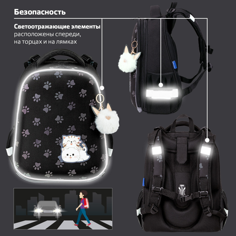 • светоотражающие элементы ранца расположены спереди, на торцах и на лямках. Они необходимы для безопасности пользователя в темное время суток;
