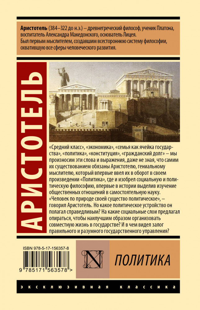 ПолитикаВ данный момент этот товар отсутствует в продаже. Возможно, у нас найдется аналогичный или похожий товар здесь. Серия: Эксклюзивная классика (Лучшее) «Средний класс», «экономика», «семья как ячейка государства», «политика», «конституция», «гражданский долг» — мы произносим эти слова и выражения, даже не зная, что самим их существованием обязаны Аристотелю, гениальному мыслителю, который впервые ввел их в оборот в своем произведении «Политика», где и изобрел социальную и политическую философию, впервые в истории выделив изучение общественных отношений в самостоятельную науку. «Человек по природе своей существо политическое», — говорил Аристотель. Но какое политическое устройство он полагал справедливым? На какие социальные слои предлагал опираться, чтобы наилучшим образом организовать совместную жизнь в государстве? И в чем видел залог правильного и разумного государственного управления? |