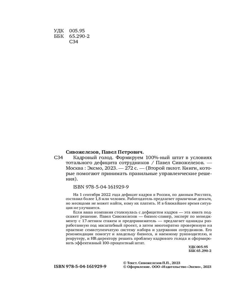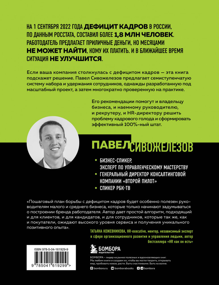 💳 Оплатить за товар можно при получении 🇰🇿 Есть бесплатная доставка по Казахстану от 1 дня 🎁 Копите бонусы с каждой покупки Серия: Второй пилот. Книги, которые помогают принимать правильные управленческие решения Если ваша компания столкнулась с дефицитом кадров, — эта книга подскажет решение. Павел Сивожелезов — бизнес-спикер, эксперт по менеджменту с 17-летним стажем и предприниматель — предлагает однажды разработанную под масштабный проект, а затем многократно проверенную на практике семиступенчатую систему набора и удержания сотрудников. Его рекомендации помогут и владельцу бизнеса, и наемному руководителю, и рекрутеру, и HR-директору решить проблему кадрового голода и сформировать эффективный 100-процентный штат. |