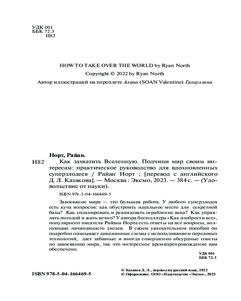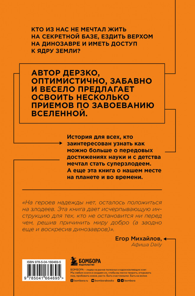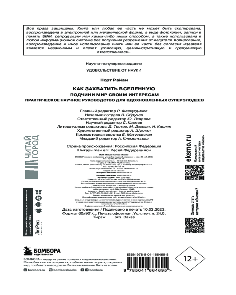 💳 Оплатить за товар можно при получении 🇰🇿 Есть бесплатная доставка по Казахстану от 1 дня 🎁 Копите бонусы с каждой покупки Серия: Удовольствие от науки Вам не обязательно быть криминальным гением, чтобы разделять мечты суперзлодеев к завоеванию мира. Новая книга Райана Норта не просто рассказывает о том, как захватить мир, она показывает, как вы могли бы его спасти, устранив ряд величайших угроз, с которыми сталкивается человечество. Эта книга заставляет задуматься о нашем месте на планете и во времени. |