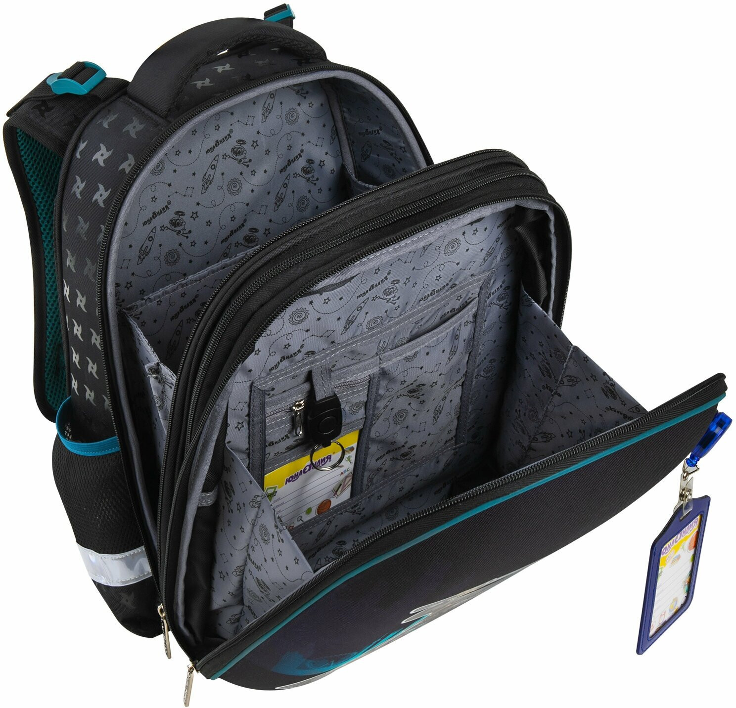 Удобная мягкая вентилируемая спинка с воздушными спонжевыми панелями разработана с учетом анатомических особенностей детей младшего школьного возраста. При правильной регулировке ранец будет практически не ощущаться на плечах и не будет доставлять дискомфорт при носке. В процессе эксплуатации равномерное распределение нагрузки позволит сохранить правильную осанку! В основном отделении ранца можно легко и быстро разместить учебники и тетради между плотными перегородками. Внутри фронтального отделения находится органайзер для канцтоваров, именная карточка, карман для телефона, карабин для ключей и большое отделение из сетки. Такая организация пространства поможет держать принадлежности в сохранности и приучить ребенка к порядку. Ранец широко раскрывается, повышая удобство использования, а за счёт боковых перегородок содержимое не выскользнет из ранца.
