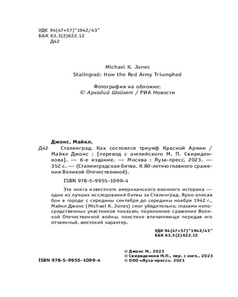 💳 Оплатить за товар можно при получении 🇰🇿 Есть бесплатная доставка по Казахстану от 1 дня 🎁 Копите бонусы с каждой покупки Серия: Сталинградская битва. К 80-летию главного сражения Великой Отечественной Эта книга — не просто мощное и профессиональное исследование Битвы за Сталинград. В отличие от работ других зарубежных авторов, читатель не найдет на ее страницах привычных штампов о «кровавых комиссарах» и заградотрядах, сотнями расстреливавших своих. Известный американский военный историк фокусирует внимание на рядовых бойцах Красной Армии, отвечая на главный вопрос: что заставляло их стойко сражаться в невероятно тяжелых условиях? Ярко описав бои в городе на Волге с середины сентября до середины ноября 1942 года, Майкл Джонс (Michael К. Jones) смог убедительно, глазами непосредственных участников, показать сражение за Сталинград, поистине впечатляюще передав его отчаянный, жестокий характер. Используя архивные документы для подтверждения драматических свидетельств ветеранов 62-й армии В.И. Чуйкова он, исправляет многие закрепившиеся ошибки в изображении хода Сталинградской битвы, победа в которой стала невероятным триумфом человеческого духа. |