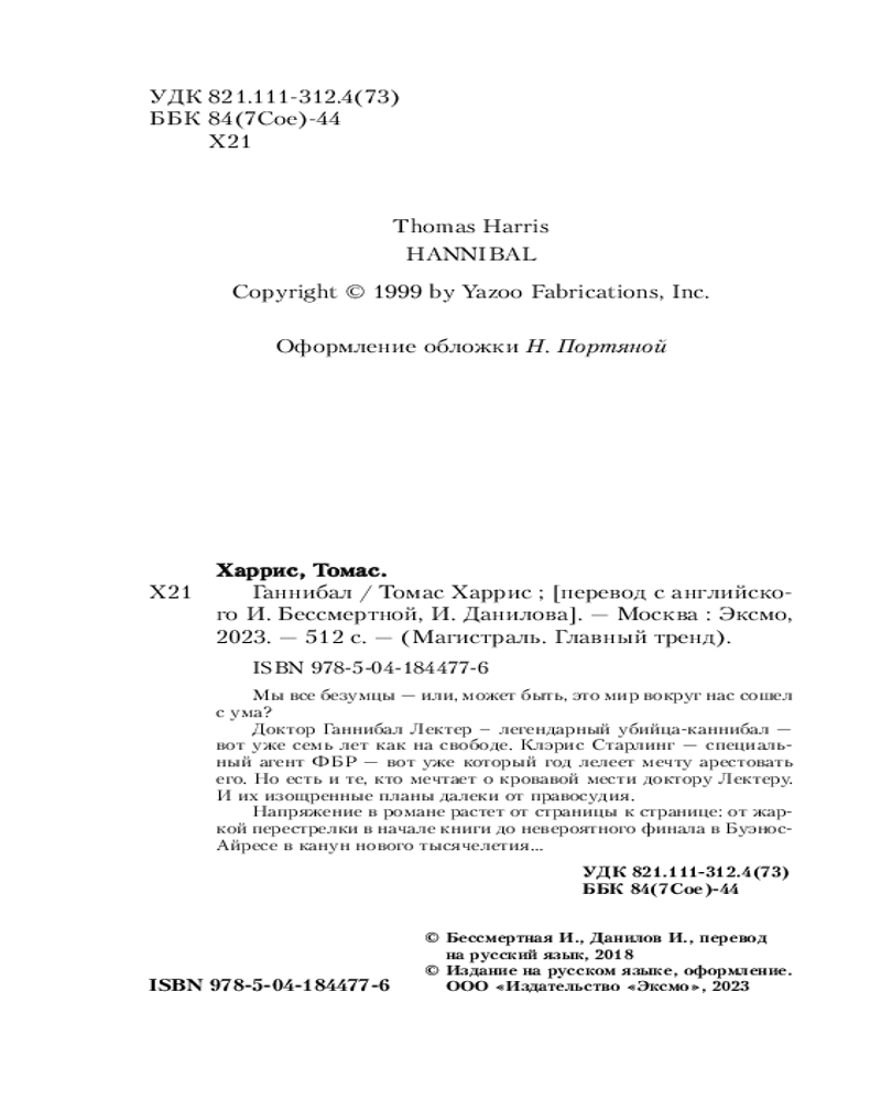 💳 Оплатить за товар можно при получении 🇰🇿 Есть бесплатная доставка по Казахстану от 1 дня 🎁 Копите бонусы с каждой покупки Серия: Магистраль. Главный тренд Феноменальное продолжение романов «Красный дракон» и «Молчание ягнят» было экранизировано знаменитым Ридли Скоттом с неподражаемым Энтони Хопкинсом в главной роли. Интеллектуальный поединок между Ганнибалом Лектером и Клэрис Старлинг продолжается. Охота за доктором выйдет далеко за пределы США. Но не только ФБР готово на все, чтобы схватить Лектера. Ускользая от своих преследователей, ему все же придется столкнуться со своим главным противником — агентом Старлинг. Сможет ли кто-то из них выйти победителем? |