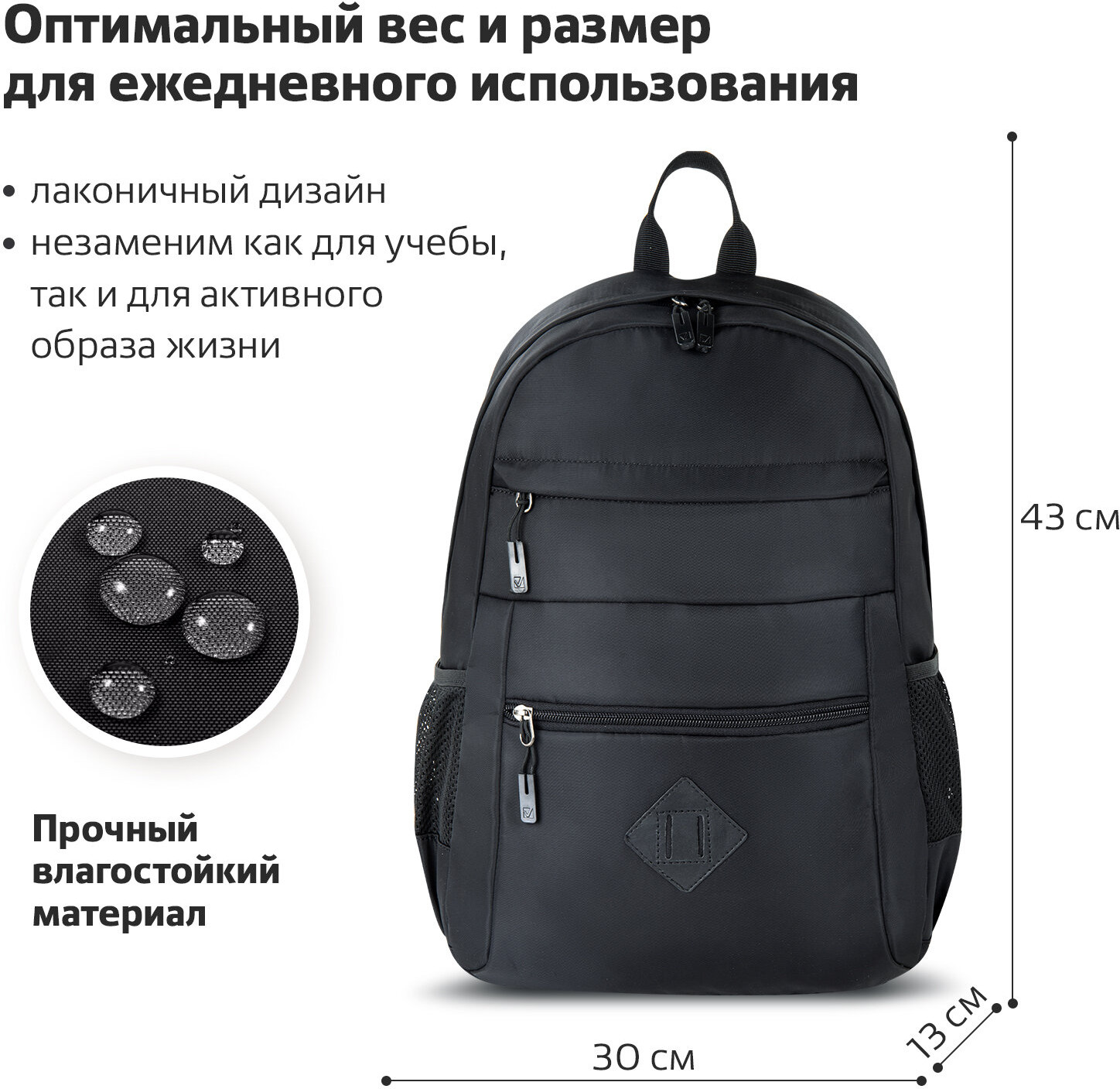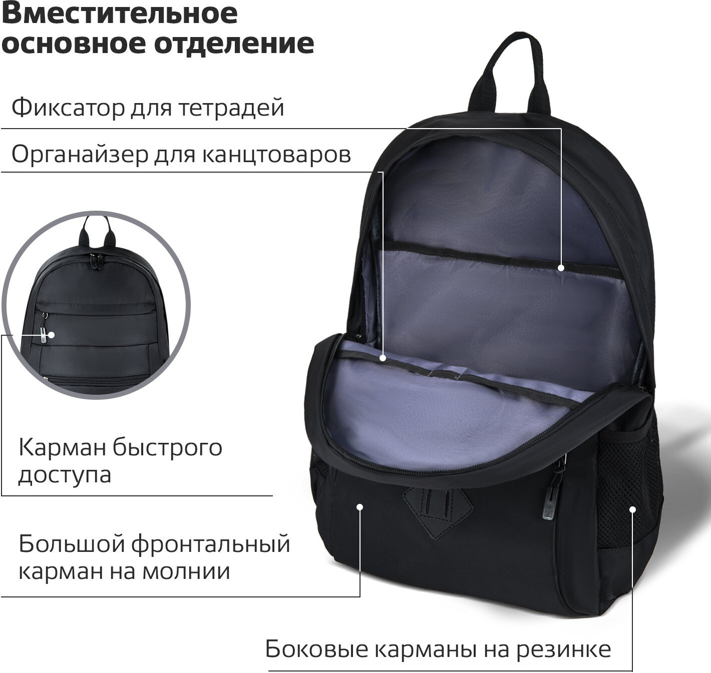 Это невероятно удобная, легкая, функциональная и эргономичная модель для учебы, отдыха и активного времяпровождения. Множество карманов и вместительное основное отделение позволят упорядоченно разложить большое количество вещей различных размеров, в зависимости от целей использования рюкзака. Учебные пособия, канцтовары, папки формата А4, крупногабаритные предметы, например, одежда, вещи первой необходимости, такие как салфетки, платочки, бутылочка с водой, ключи, кошелек, документы и другие важные мелочи можно с легкостью разметить в рюкзаке.