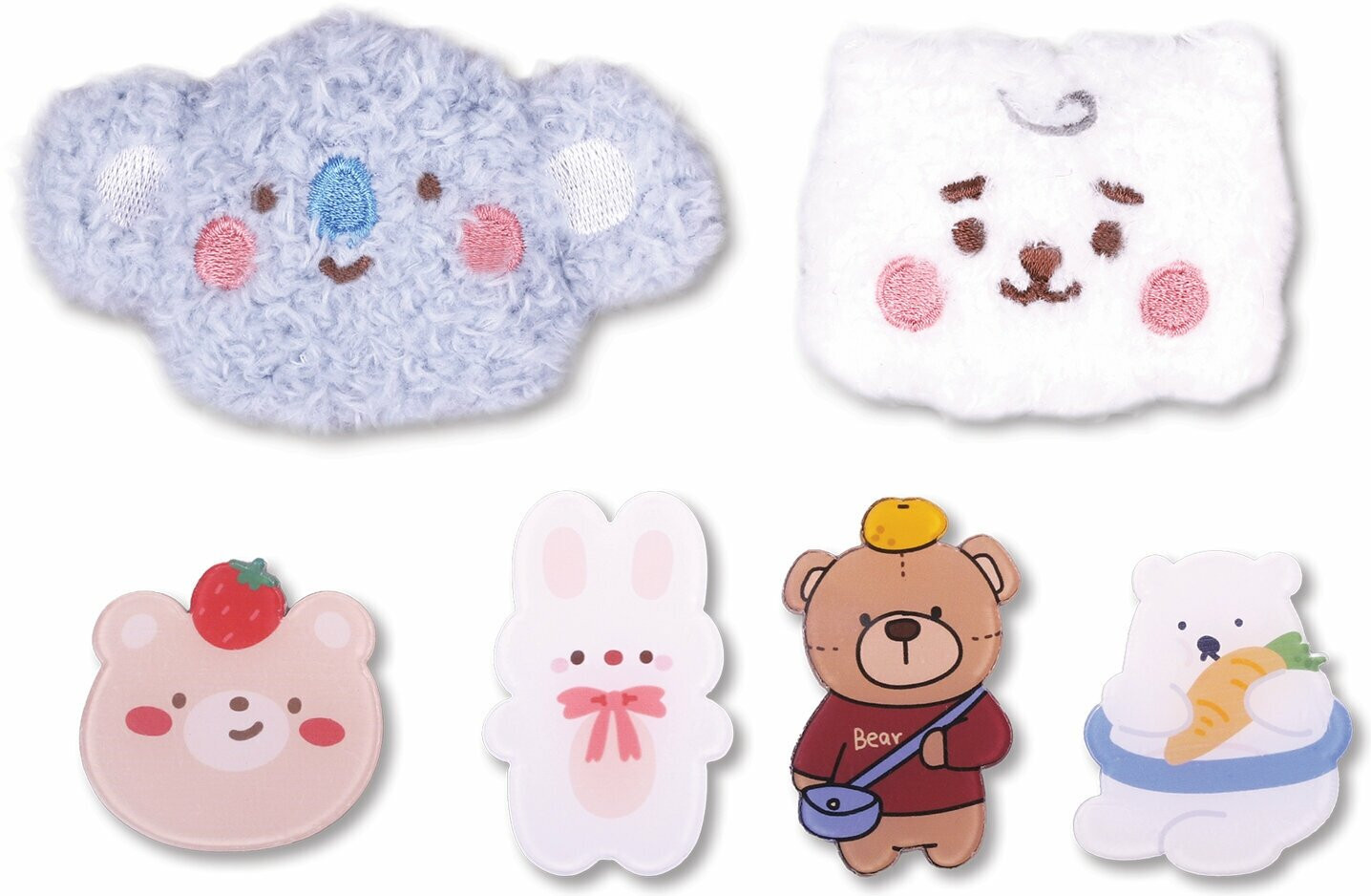 К набору прилагается 6 значков для декорирования: 2 мягких плюшевых значка в виде забавных мордочек животных и 4 пластиковых значка с милыми зверятами.