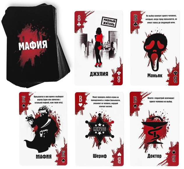 💳 Оплатить за товар можно при получении 🇰🇿 Есть бесплатная доставка по Казахстану от 1 дня 🎁 Копите бонусы с каждой покупки Серия: Карты игральные В городе снова орудует мафия! На этот раз пощады не будет никому. Доктора, полицейские и обычные жители в ужасе, ведь никто не хочет встретиться лицом к лицу с преступниками... |