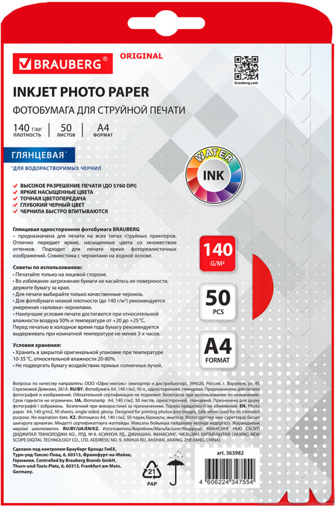 💳 Оплатить за товар можно при получении 🇰🇿 Есть бесплатная доставка по Казахстану от 1 дня 🎁 Копите бонусы с каждой покупки Серия: Original Глянцевая односторонняя фотобумага BRAUBERG подходит для всех типов струйных принтеров. Незаменима для печати ярких фотореалистичных изображений. Передает яркие, насыщенные цвета со множеством оттенков. Гладкая поверхность обеспечивает превосходное качество, а особый состав — идеальную цветопередачу. Печать возможна только водорастворимыми чернилами. |