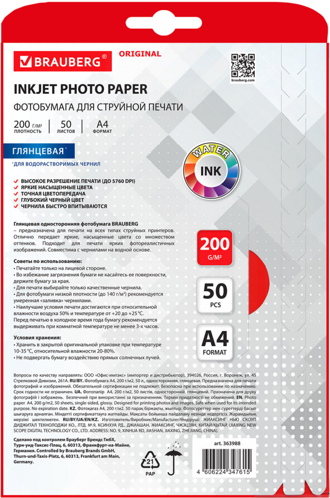 💳 Оплатить за товар можно при получении 🇰🇿 Есть бесплатная доставка по Казахстану от 1 дня 🎁 Копите бонусы с каждой покупки Серия: Original Глянцевая односторонняя фотобумага BRAUBERG подходит для всех типов струйных принтеров. Незаменима для печати ярких фотореалистичных изображений. Передает яркие, насыщенные цвета со множеством оттенков. Гладкая поверхность обеспечивает превосходное качество, а особый состав — идеальную цветопередачу. Печать возможна только водорастворимыми чернилами. |