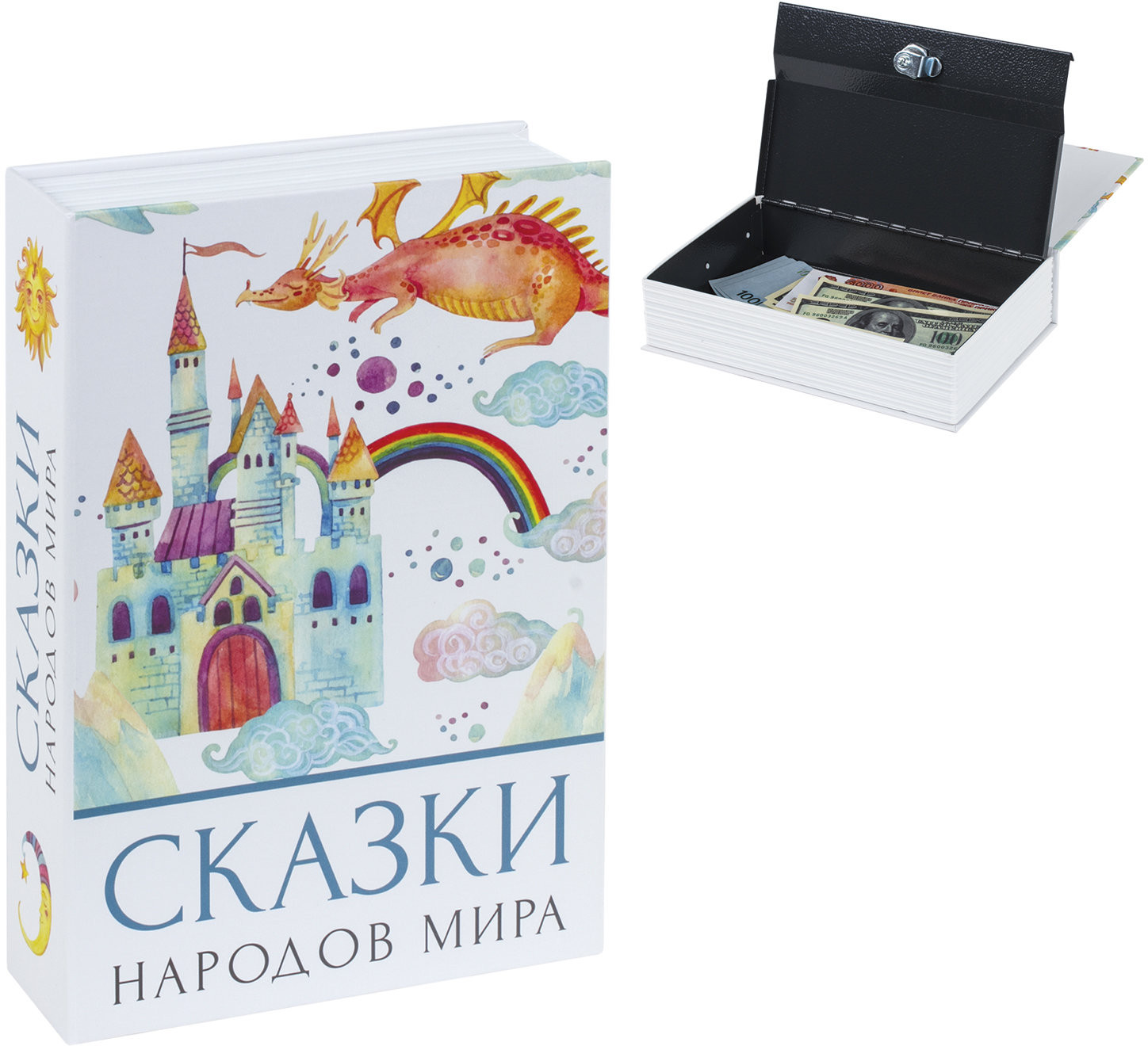 Ящик стилизован под книгу «Сказки народов мира». Книга-сейф — это металлический бокс в виде ложной книги. Предназначен для хранения мелких ценных вещей: документы, медикаменты, печати, мелкая наличность. Оригинальный, удобный бокс, который можно использовать как тайничок: бокс маскируется под книжку, незаметен среди других книг на полке. Главная особенность такой вещи в том, что выглядит она весьма оригинально, благодаря чему нравится многим. Фраза «Книга — лучший подарок» еще никогда не была так актуальна.