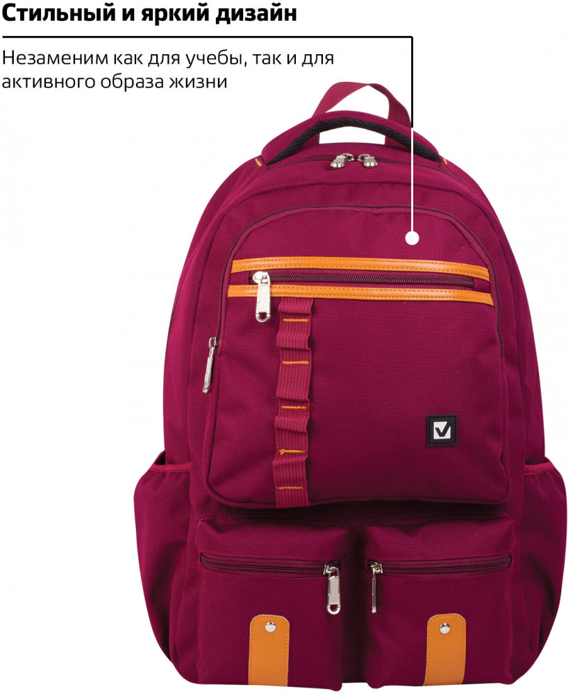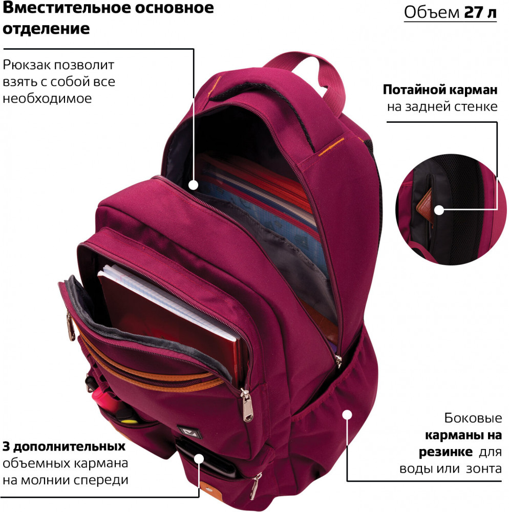 • рюкзак имеет боковые карманы, три объемных кармана на молнии на передней стенке и потайной карман на задней стенке;