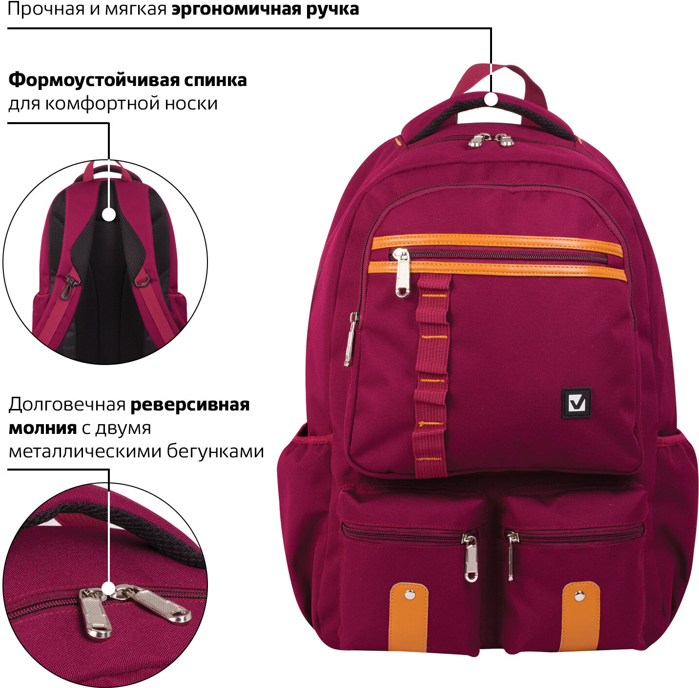 • каждое отделение рюкзака имеет долговечную реверсивную молнию с двумя металлическими бегунками;