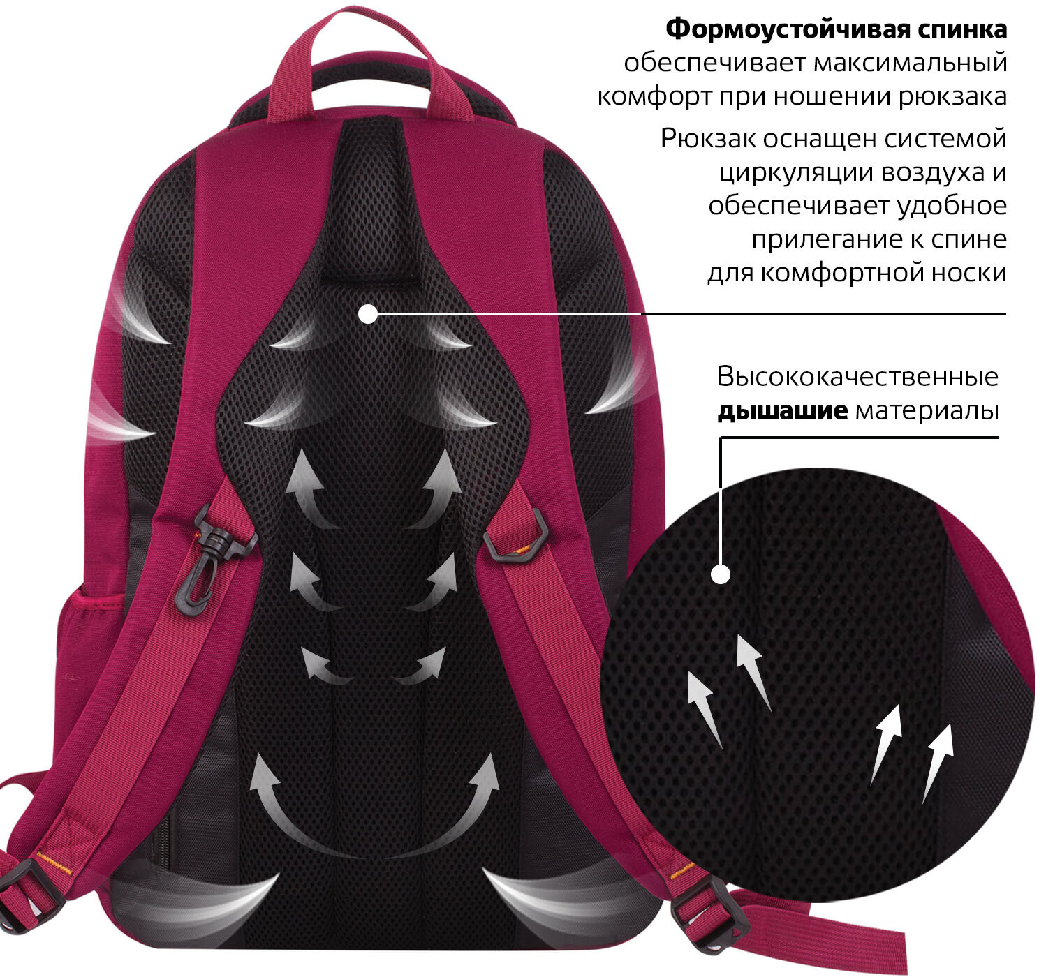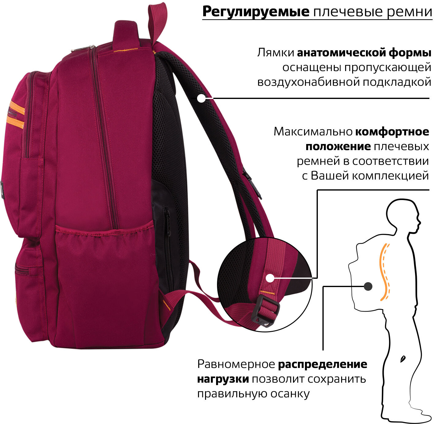 • формоустойчивая спинка и эргономичные регулируемые плечевые ремни анатомической формы, оснащенные пропускающей воздух набивной подкладкой, обеспечивают максимальный комфорт при ношении рюкзака;