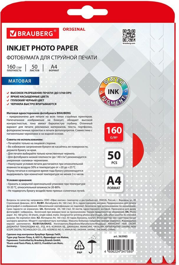 💳 Оплатить за товар можно при получении 🇰🇿 Есть бесплатная доставка по Казахстану от 1 дня 🎁 Копите бонусы с каждой покупки Серия: Original Матовая односторонняя фотобумага подходит для всех типов струйных принтеров. Незаменима для печати рекламных материалов, текста, портфолио и фотопортретов. Напечатанное изображение не бликует, а тона имеют бархатистую глубину. |