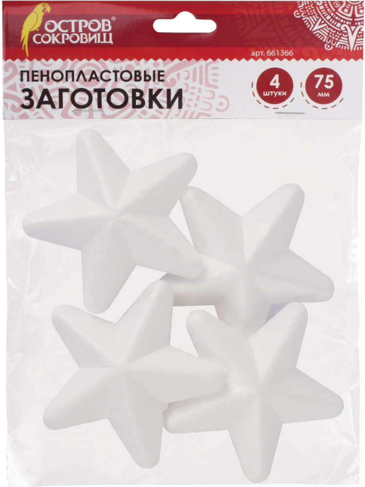 Предоставляют безграничное число возможностей для реализации самых разнообразных творческих идей. Изготовлены из пенопласта белого цвета. В наборе 4 заготовки в форме звёзд. Предназначены для детей от 3 лет. Размер 75×75 мм. Поставляются в пакете с европодвесом.
