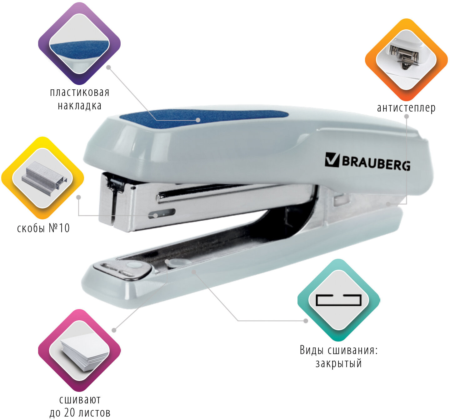 Способен скрепить до 20 листов. Подходящий размер скоб № 10. Глубина закладки бумаги — 55 мм. Вид сшивания: закрытый. Данная модель может выступать в качестве антистеплера, позволяющего разжать закрепленные скобы более качественно, не нанося повреждений ни материалу, ни кончикам пальцев. За счет компактных размеров не займет на рабочем столе много места, а классическое сочетание цветов и дизайн будут отлично дополнять любой интерьер.