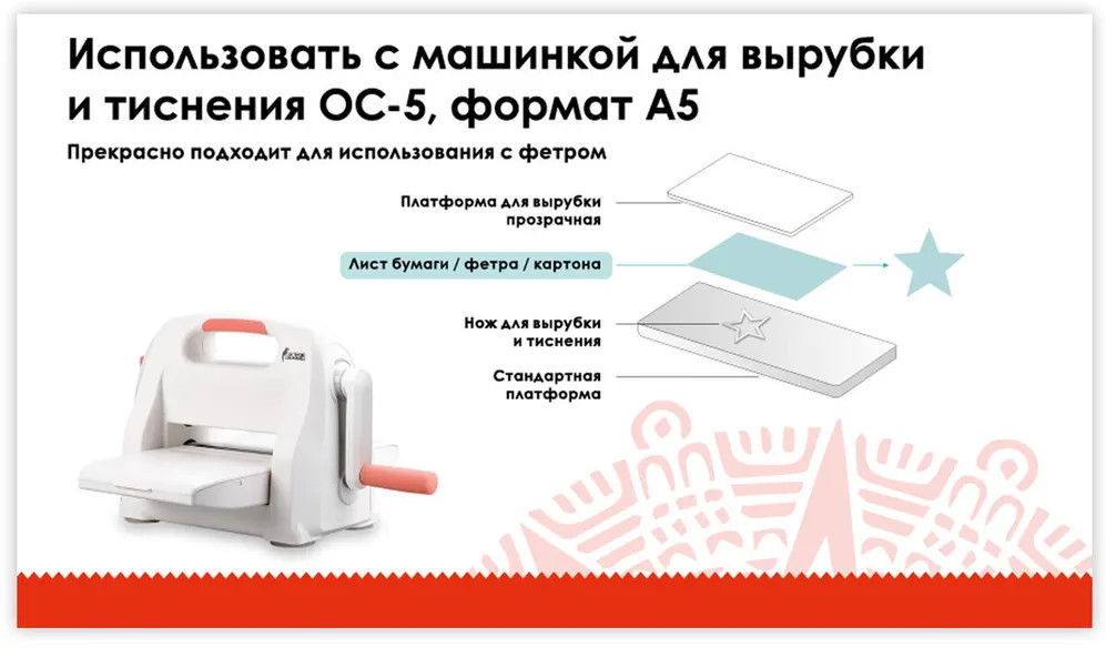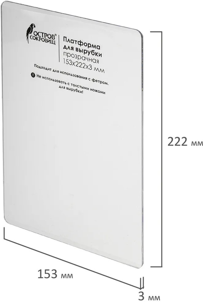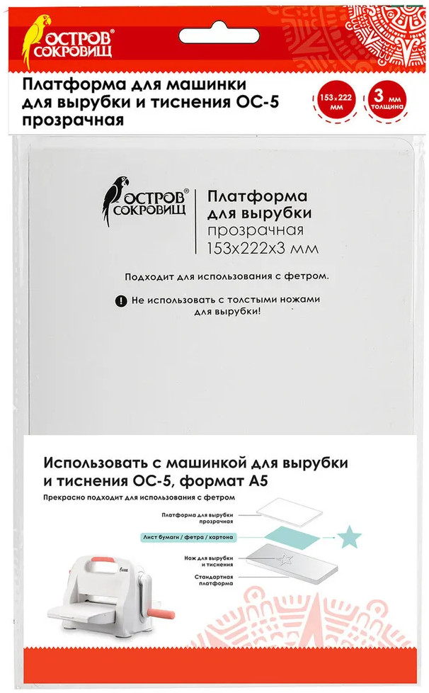 💳 Оплатить за товар можно при получении 🇰🇿 Есть бесплатная доставка по Казахстану от 1 дня 🎁 Копите бонусы с каждой покупки Прозрачная платформа для машинки для вырубки и тиснения Остров сокровищ используется совместно с машинкой для вырубки и тиснения ОС-5. Подходит для любых ножей для вырубки и папок для тиснения формата А5 и меньшего, особенно хорошо подходит для фетра. Прозрачная платформа для машинки для вырубки и тиснения размером 15,3 × 22,2 × 0,3 см прекрасно подходит для создания вырубок из фетра, при этом может быть использована и с другими материалами (бумага, картон, фоамиран и т.д.). |