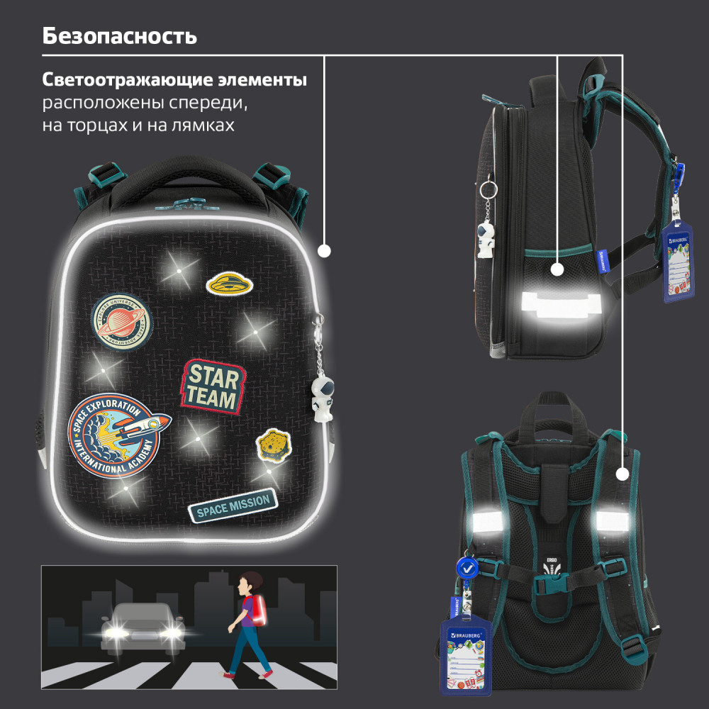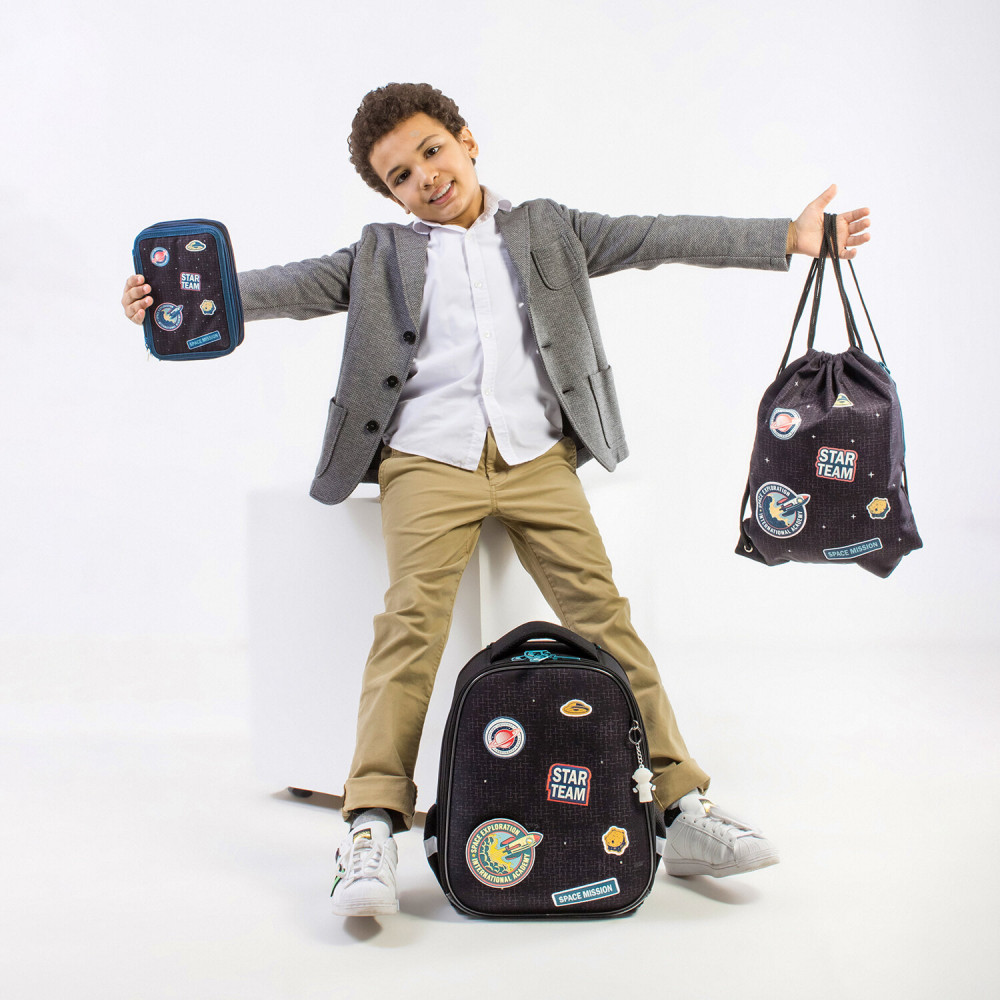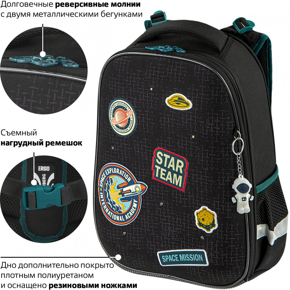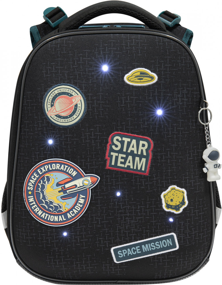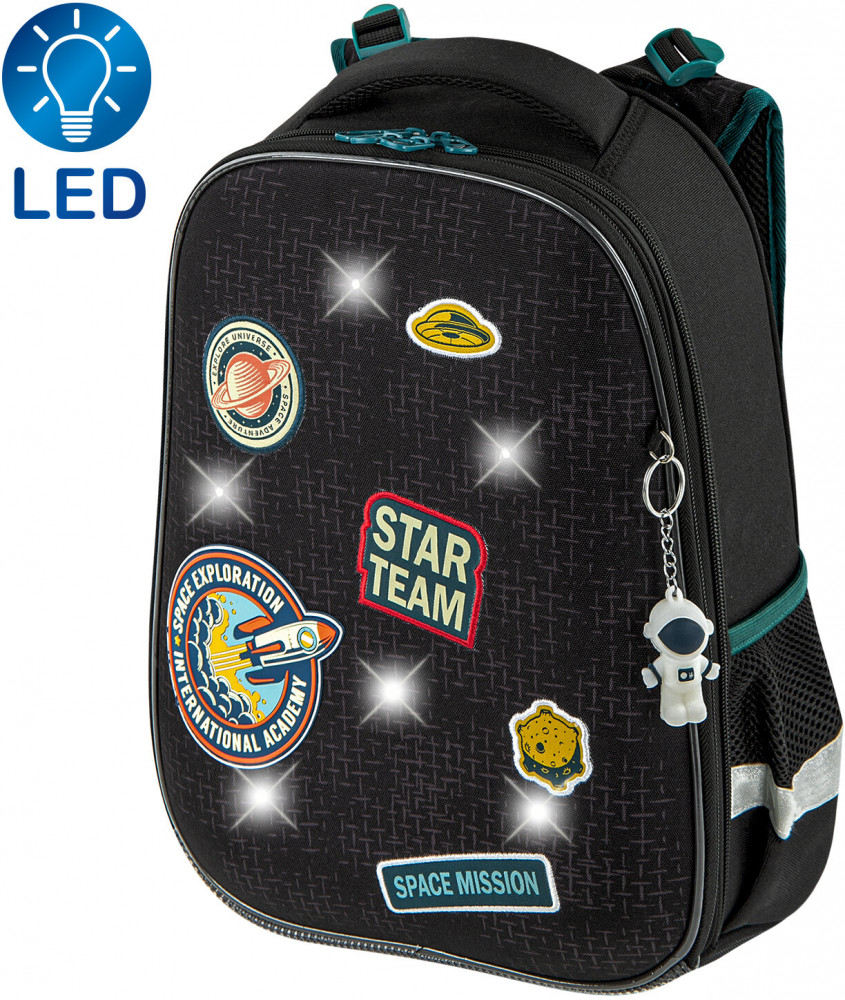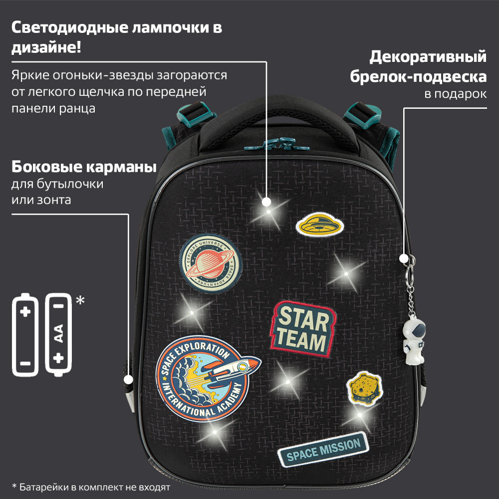 Уникальность данного ранца заключается в использовании светодиодных лампочек в дизайне. Легкий щелчок по передней панели ранца и загораются яркие огоньки, похожие на звезды в ночном небе. Светодиодные лампочки дополнены тематическими аппликациями, которые продолжают тему звездного неба и космоса. Для блока питания светодиодных лампочек используются два элемента питания формата АА (пальчиковые батарейки). Внимание: батарейки в комплект не входят и приобретаются отдельно! Также для того, чтобы заработала подсветка, на блоке питания нужно перевести переключатель в режим «ON». Ранец покрыт высококачественной влагоотталкивающей нейлоновой тканью — кордура, в которой за счёт особой структуры нити достигнута четырёхкратная стойкость к истиранию по сравнению с простым нейлоном, также эта ткань легко чистится.