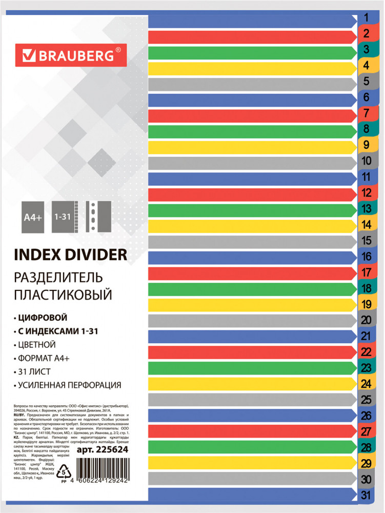 💳 Оплатить за товар можно при получении 🇰🇿 Есть бесплатная доставка по Казахстану от 1 дня 🎁 Копите бонусы с каждой покупки Серия: Standard+ Пластиковые разделители предназначены для систематизации документов внутри папок формата А4+. Изготовлены из пластика толщиной 0,12 мм. В комплект входит 31 лист синего, красного, серого, зеленого и желтого цвета, обеспечивающих возможность сортировки документов по цифрам, а также титульный лист для оглавления. Универсальная перфорация позволяет подшивать разделители во все типы папок. |