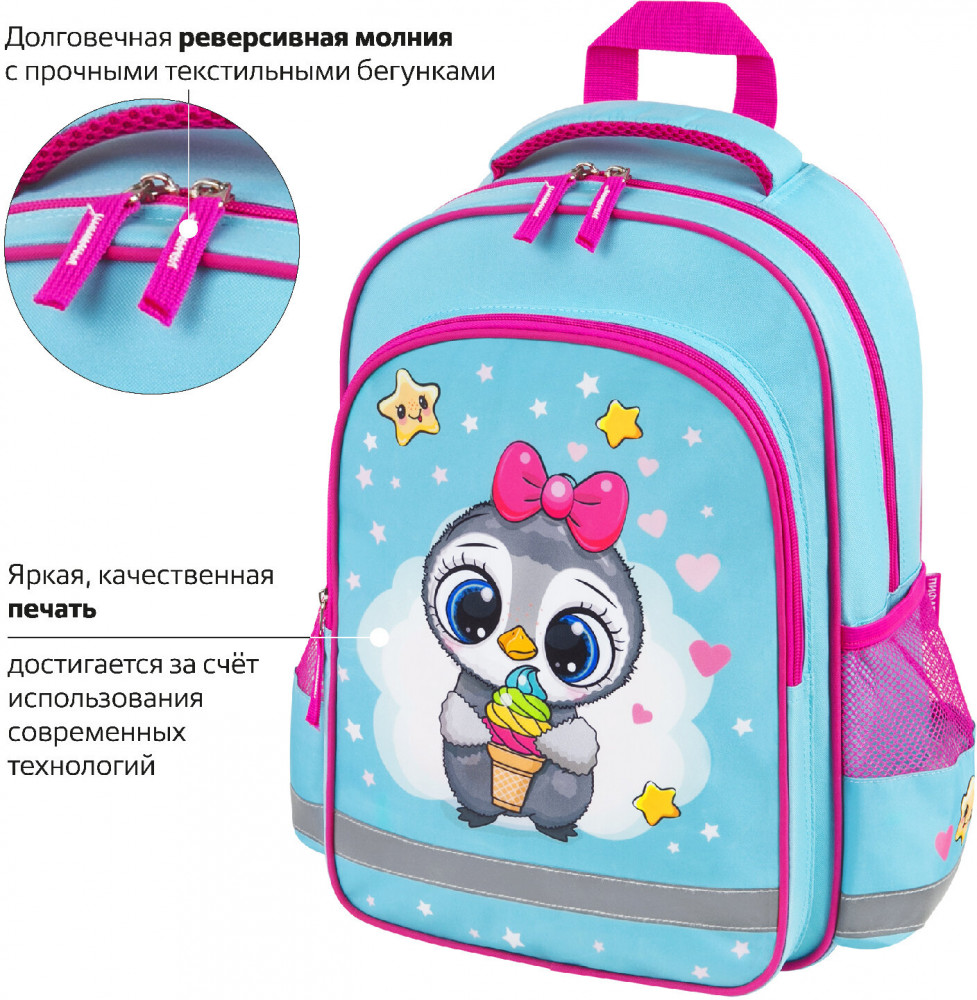 Пифагор Рюкзак школьный «Smart penguin»В данный момент этот товар отсутствует в продаже. Возможно, у нас найдется аналогичный или похожий товар здесь. Серия: School Предназначен для учеников начальной школы, выполнен из прочного полиэстера. Уплотненная спинка, лямки с внутренней поверхностью из воздушного спонжа обеспечат комфорт при носке. Рюкзак имеет 1 вместительное отделение на молнии, 1 передний и 2 боковых кармана. Оптимальный размер рюкзака позволяет вместить все необходимые школьные принадлежности. Мягкие широкие регулируемые лямки способствуют оптимальному распределению веса. |