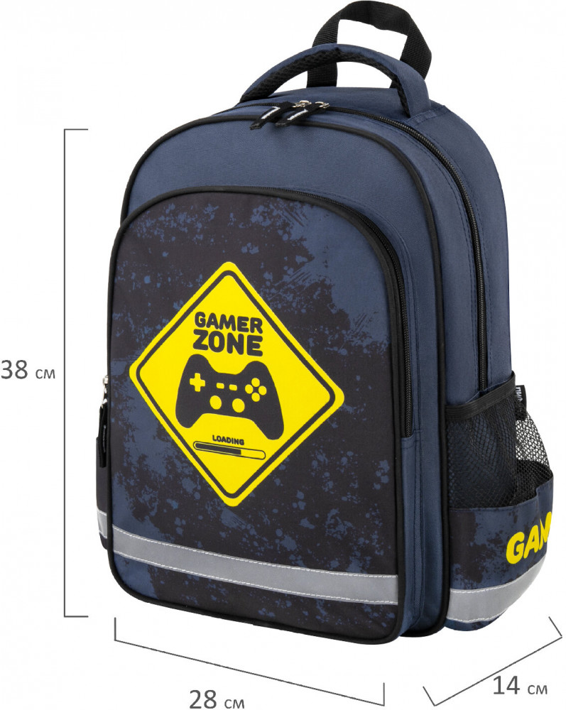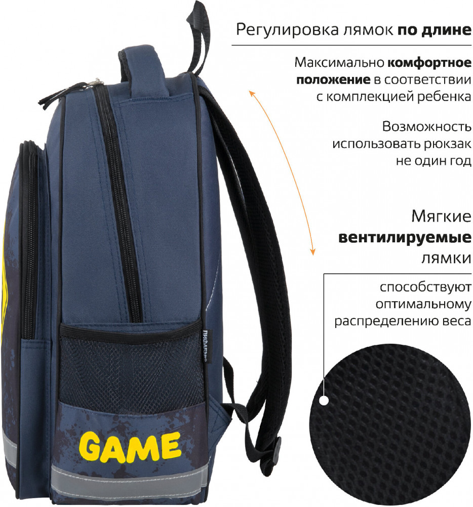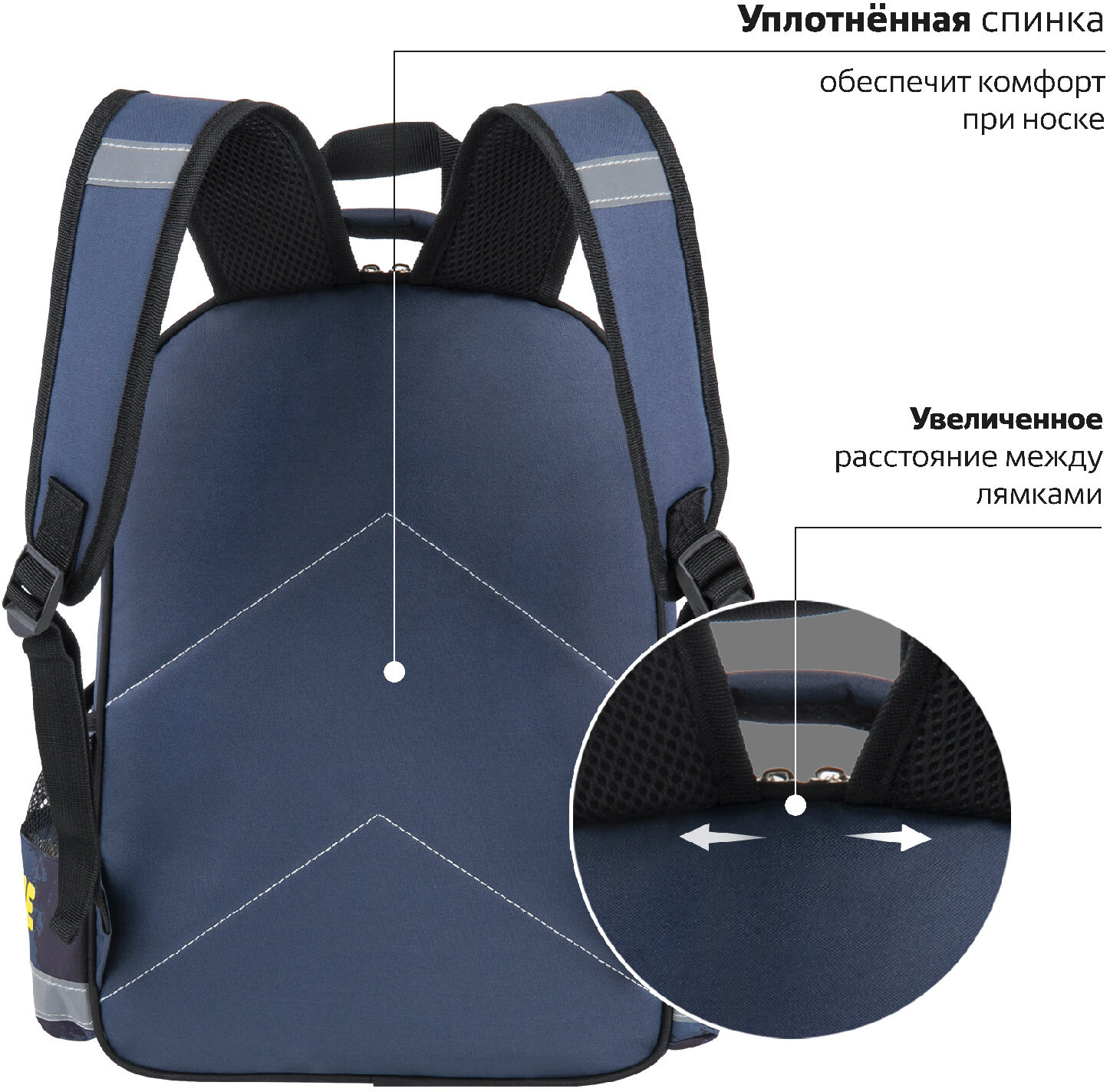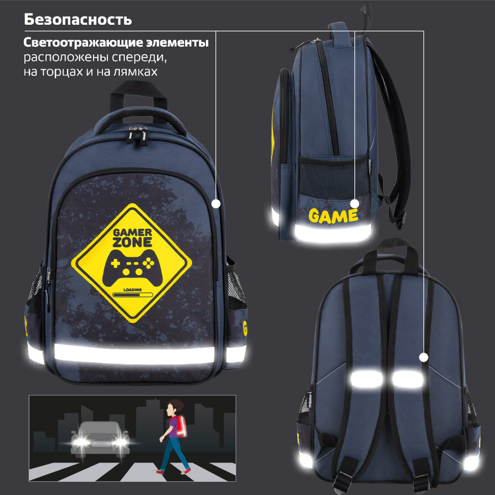 Рюкзак легко открывать и закрывать одной рукой с любой стороны — основное отделение имеет долговечную реверсивную молнию с двумя бегунками. У рюкзака есть удобная ручка из ткани для переноски и петелька для подвешивания на крючок парты. Яркая и качественная печать, насыщенный цвет рисунков достигается за счет использования современных технологий печати на ткани. Светоотражающие элементы со всех сторон ранца обеспечивают безопасность в темное время суток.